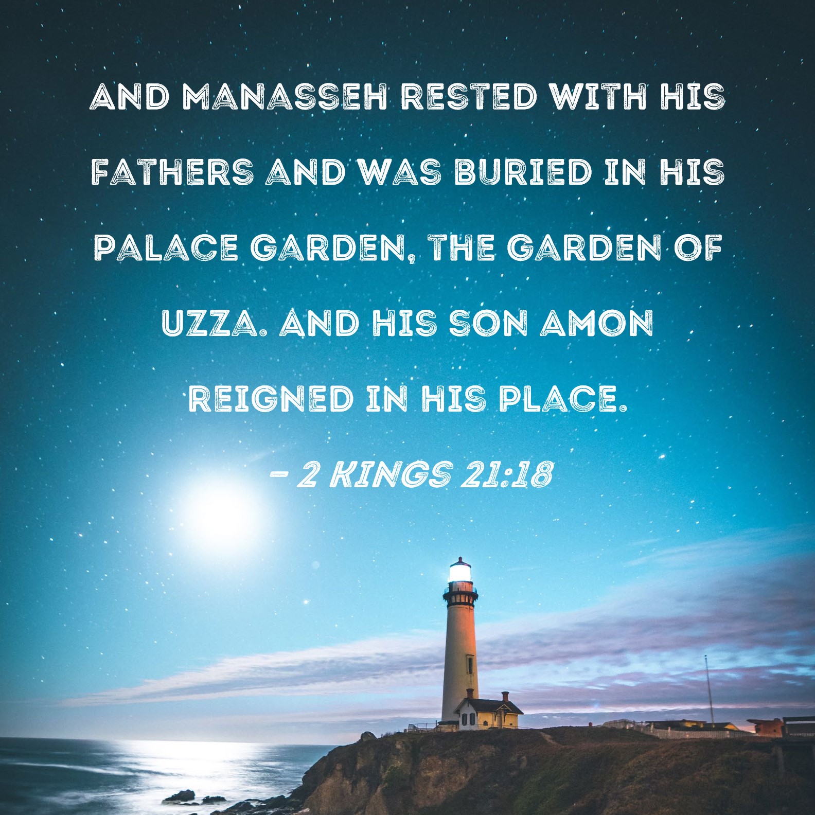 2 Kings 21:18 And Manasseh rested with his fathers and was buried in his palace garden, the garden of Uzza. And his son Amon reigned in his place.