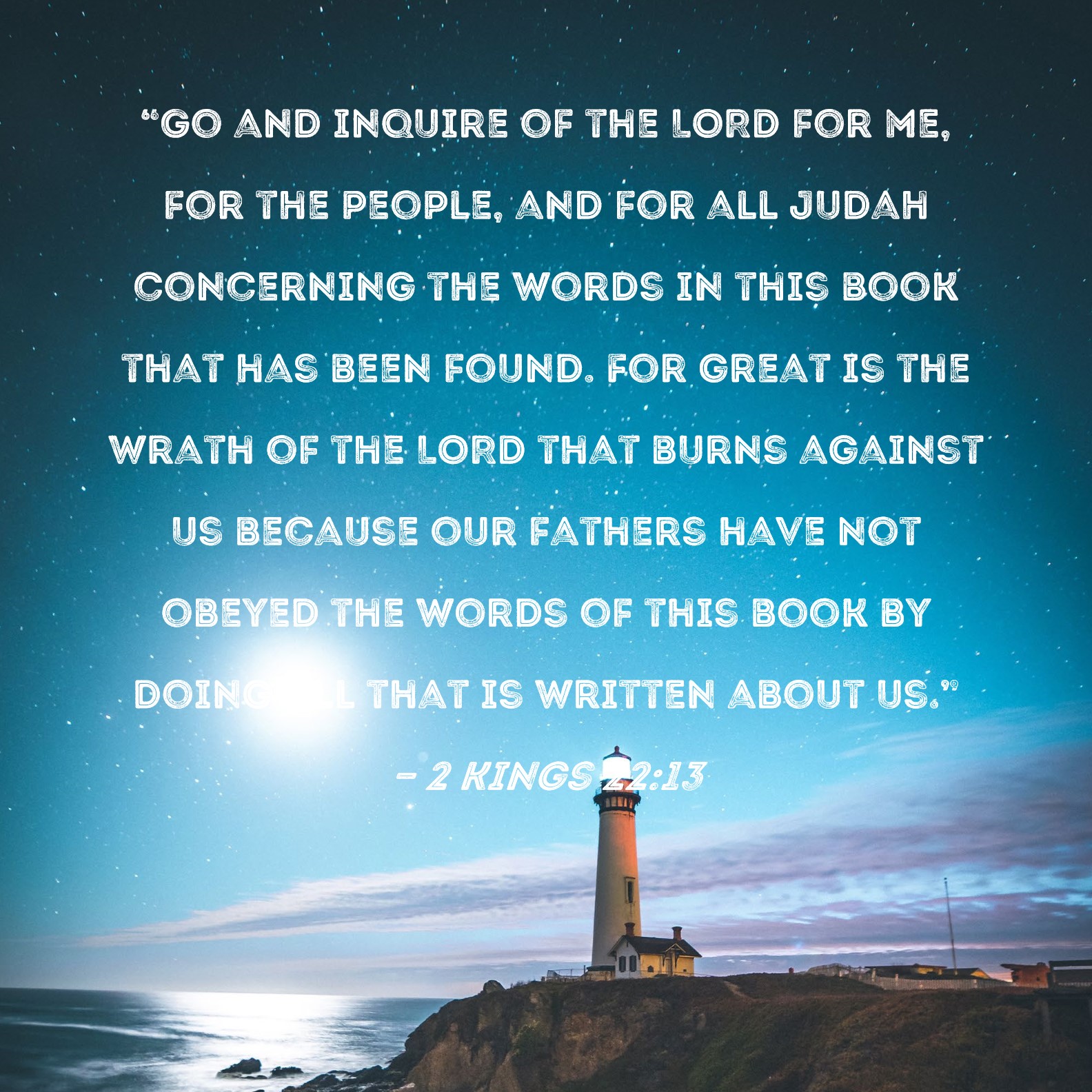 KJV:  Go ye, inquire of the LORD for me, and for the people, and for all Judah, concerning the words of this book that is found: for great is the wrath of the LORD that is kindled against us, because our fathers have not hearkened unto the words of this book, to do according unto all that which is written concerning us.