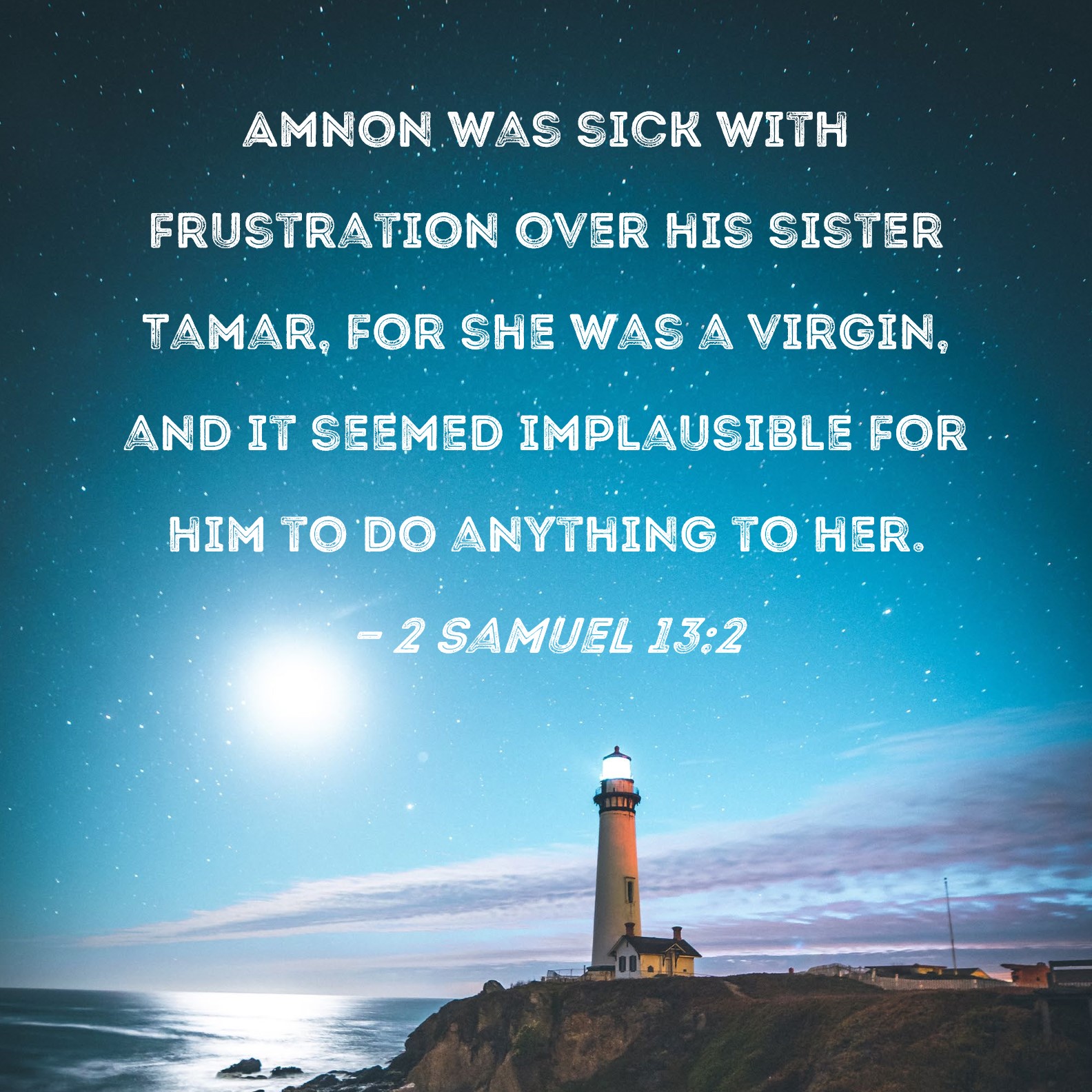 2 Samuel 13:2 Amnon was sick with frustration over his sister Tamar, for she was a virgin, and it seemed implausible for him to do anything to her.