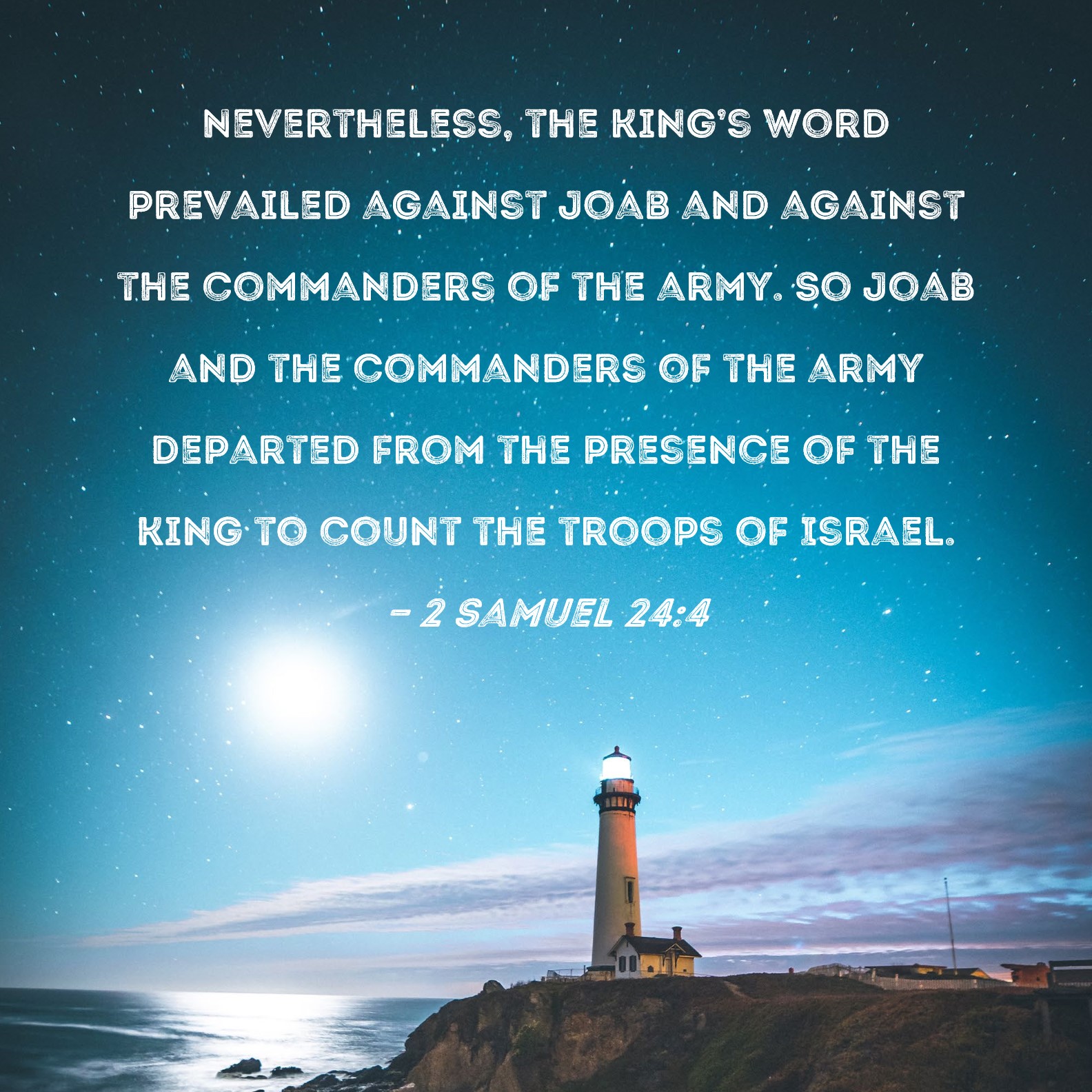 2 Samuel 24:4 Nevertheless, the king's word prevailed against Joab and against the commanders of the army. So Joab and the commanders of the army departed from the presence of the king to count the troops of Israel.