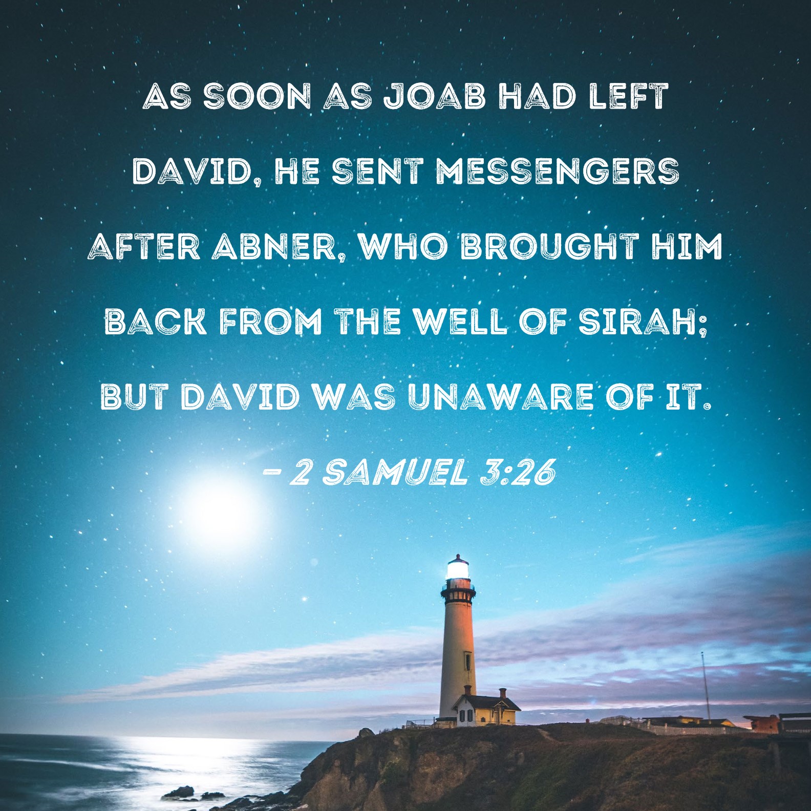 2 Samuel 3:26 As soon as Joab had left David, he sent messengers after Abner, who brought him back from the well of Sirah; but David was unaware of it.