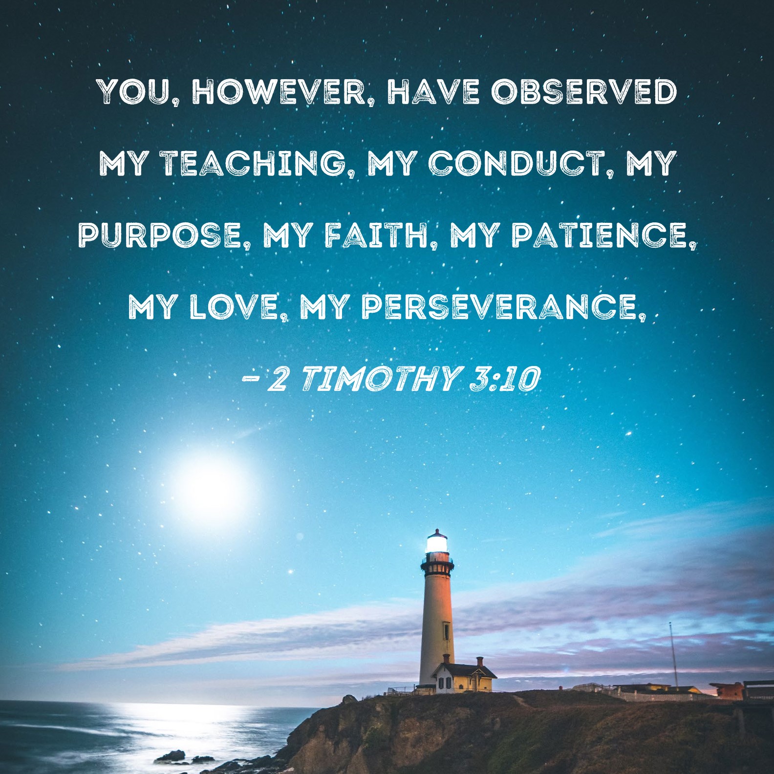 2 Timothy 3:10 You, however, have observed my teaching, my conduct, my purpose, my faith, my patience, my love, my perseverance,