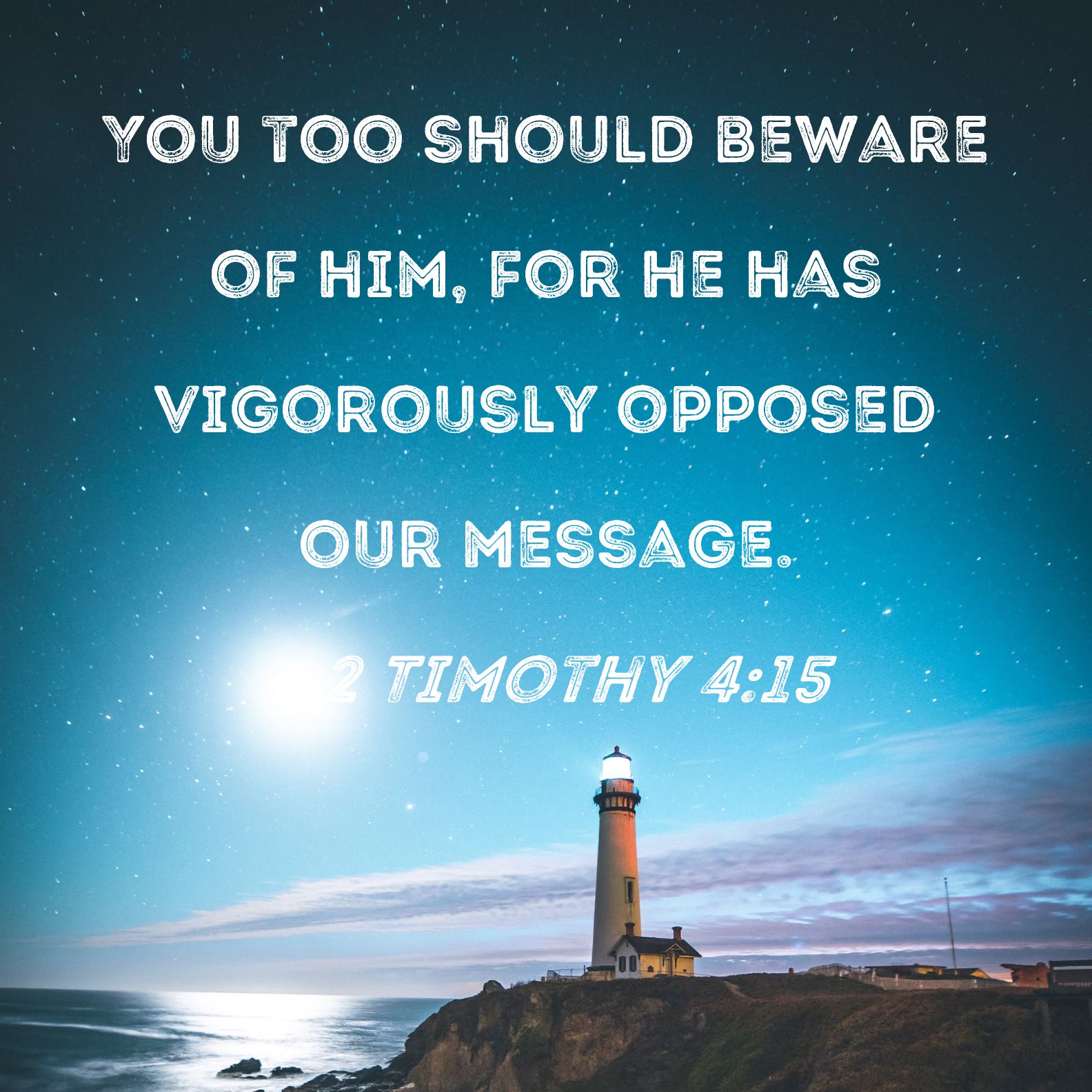2 Timothy 4:15 You too should beware of him, for he has vigorously opposed our message.