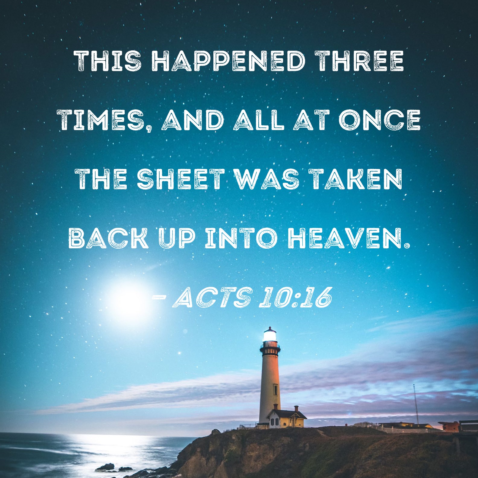 Acts 10:16 This happened three times, and all at once the sheet was taken back up into heaven.