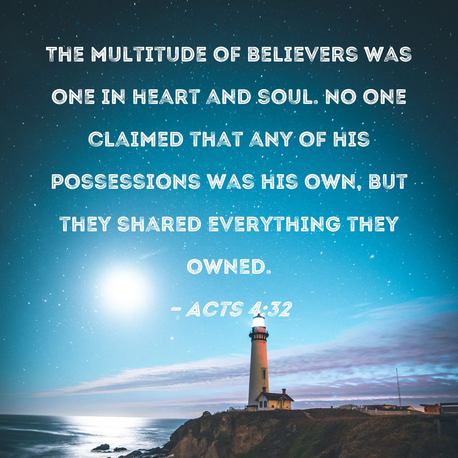 Acts 4:32 The multitude of believers was one in heart and soul. No one claimed that any of his possessions was his own, but they shared everything they owned.