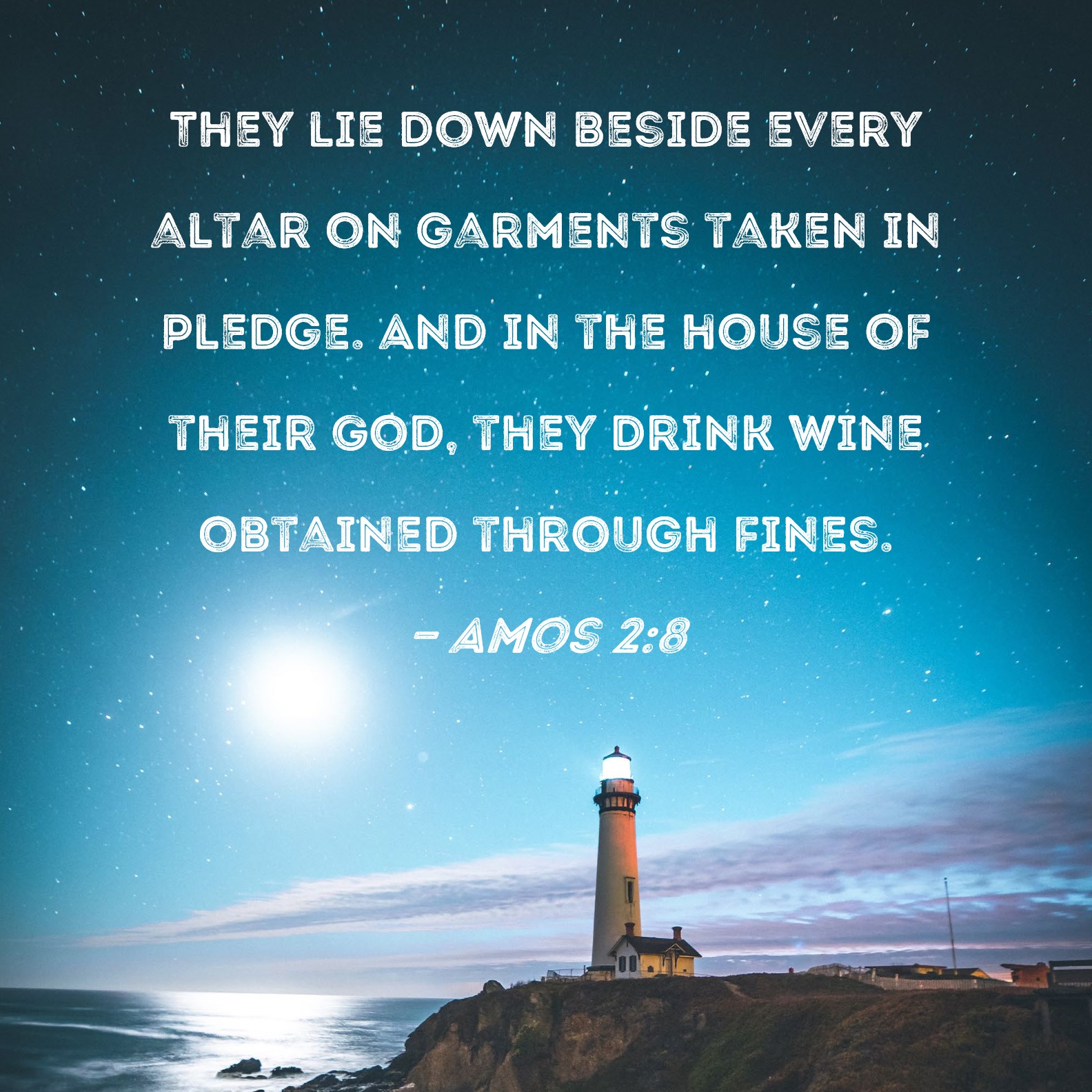Amos 2:8 They lie down beside every altar on garments taken in pledge. And in the house of their God, they drink wine obtained through fines.