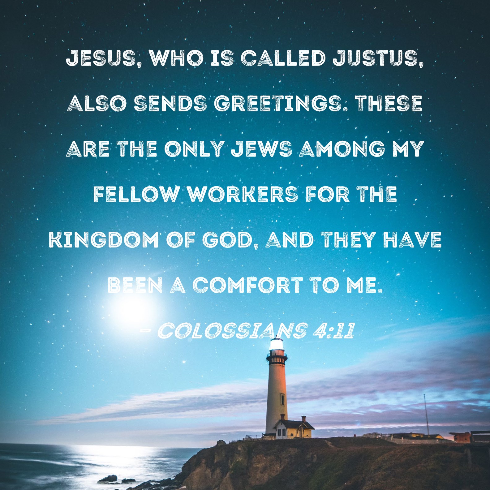 Colossians 4:11 Jesus, who is called Justus, also sends greetings. These are the only Jews among my fellow workers for the kingdom of God, and they have been a comfort to me.