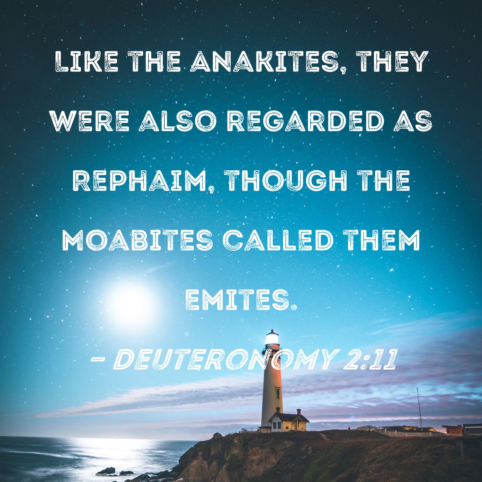 Deuteronomy 2:11 Like the Anakites, they were also regarded as Rephaim, though the Moabites called them Emites.