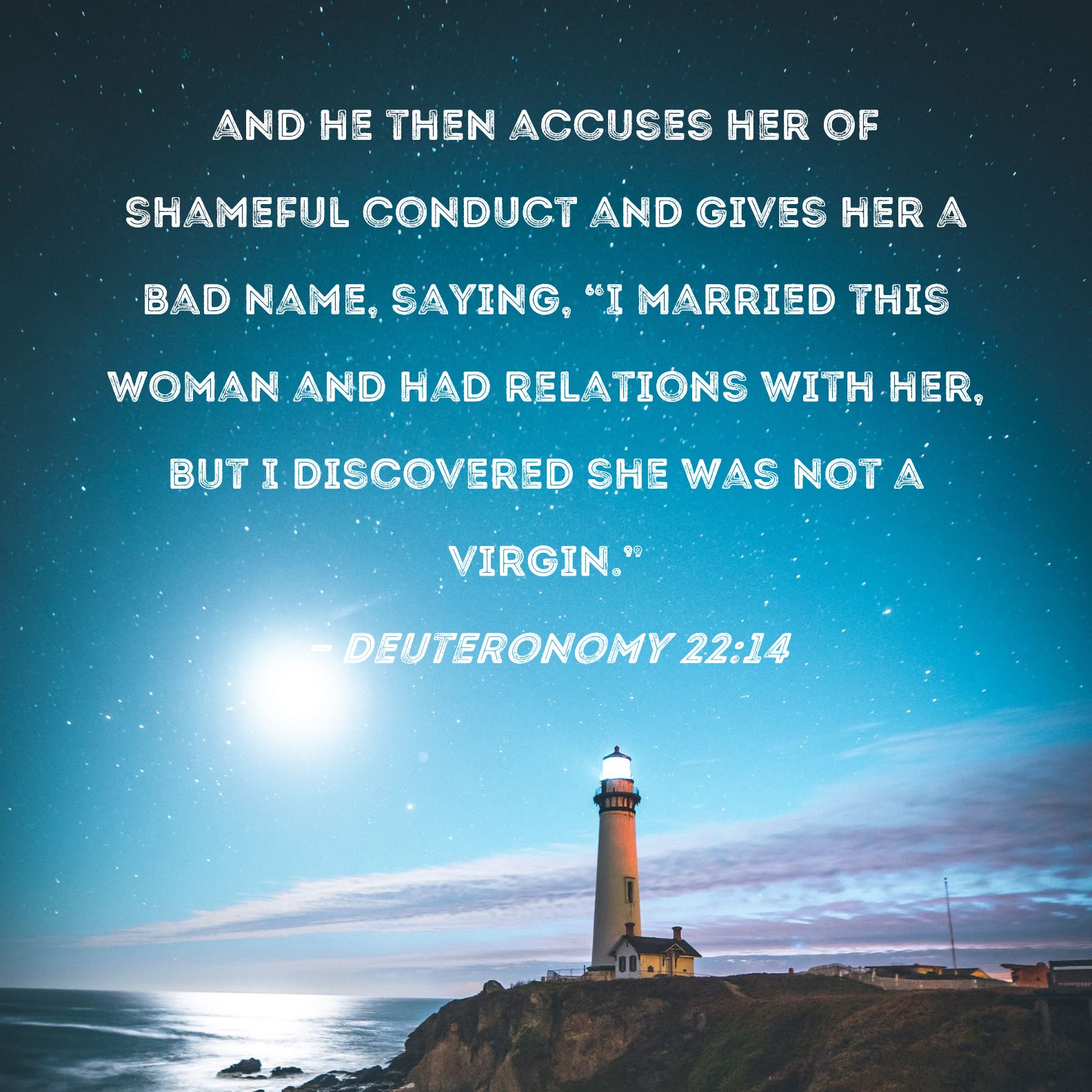 Deuteronomy 22:14 and he then accuses her of shameful conduct and gives her a bad name, saying, "I married this woman and had relations with her, but I discovered she was not a virgin."
