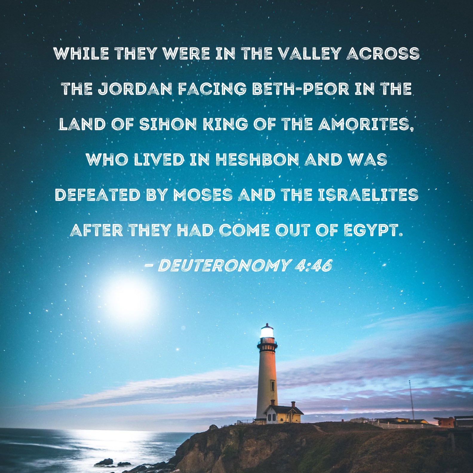 Deuteronomy 4:46 while they were in the valley across the Jordan facing Beth-peor in the land of Sihon king of the Amorites, who lived in Heshbon and was defeated by Moses and the Israelites after they had come out of Egypt.