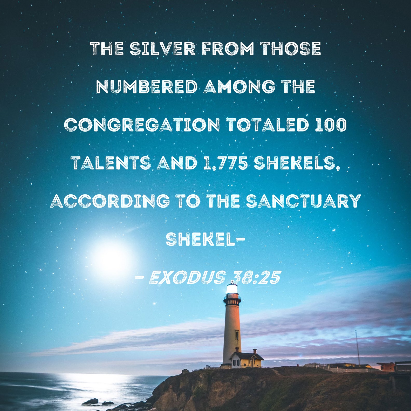 Exodus 38:25 The silver from those numbered among the congregation totaled 100 talents and 1,775 shekels, according to the sanctuary shekel--