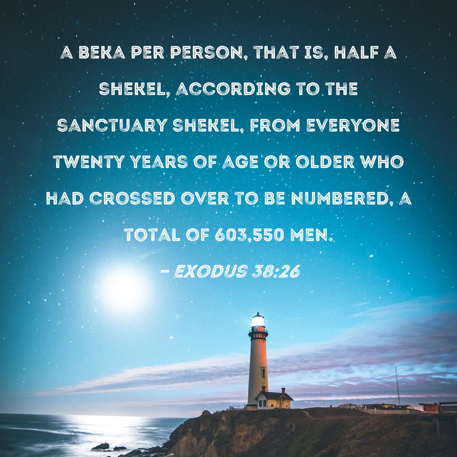 Exodus 38:26 a beka per person, that is, half a shekel, according to the sanctuary shekel, from everyone twenty years of age or older who had crossed over to be numbered, a total of 603,550 men.