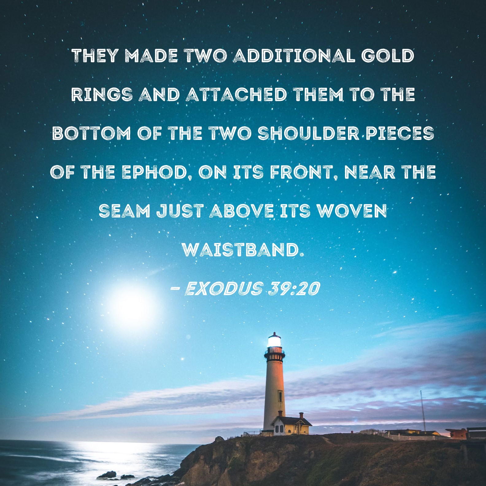Exodus 39:20 They made two additional gold rings and attached them to the bottom of the two shoulder pieces of the ephod, on its front, near the seam just above its woven waistband.