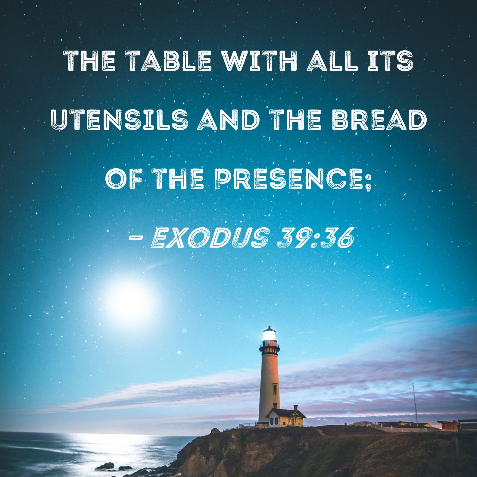 BSB: the table with all its utensils and the Bread of the Presence; KJV: The table, and all the vessels thereof, and the shewbread, DRB: The candlestick, the lamps, and the furniture of them with the oil: DBT: the table, all its utensils, and the shewbread; ERV: the table, all the vessels thereof, and the shewbread; WBT: The table, and all its vessels, and the show-bread, WEB: the table, all its vessels, the show bread, YLT: the table, all its vessels, and the bread of the presence;Links Exodus 39:36 NIV • Exodus 39:36 NLT • Exodus 39:36 ESV • Exodus 39:36 NASB • Exodus 39:36 KJV • Exodus 39:36 Interlinear • Exodus 39:36 Commentaries • Exodus 39:36 Parallel Texts • Exodus 39:36 Bible Apps • Exodus 39:36 Parallel • Bible Hub |