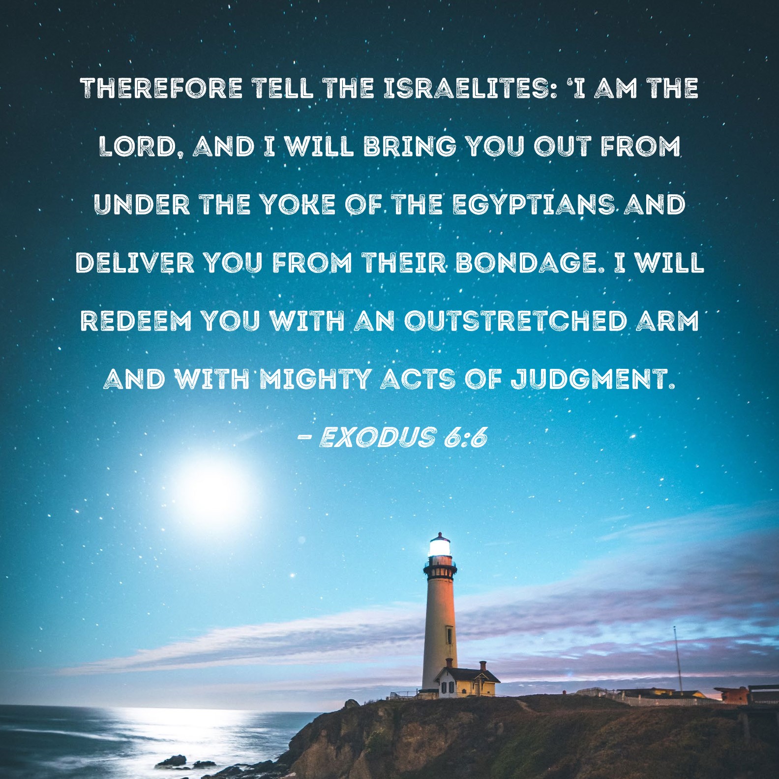 Exodus 6:6 Therefore tell the Israelites: 'I am the LORD, and I will bring you out from under the yoke of the Egyptians and deliver you from their bondage. I will redeem you with an outstretched arm and with mighty acts of judgment.