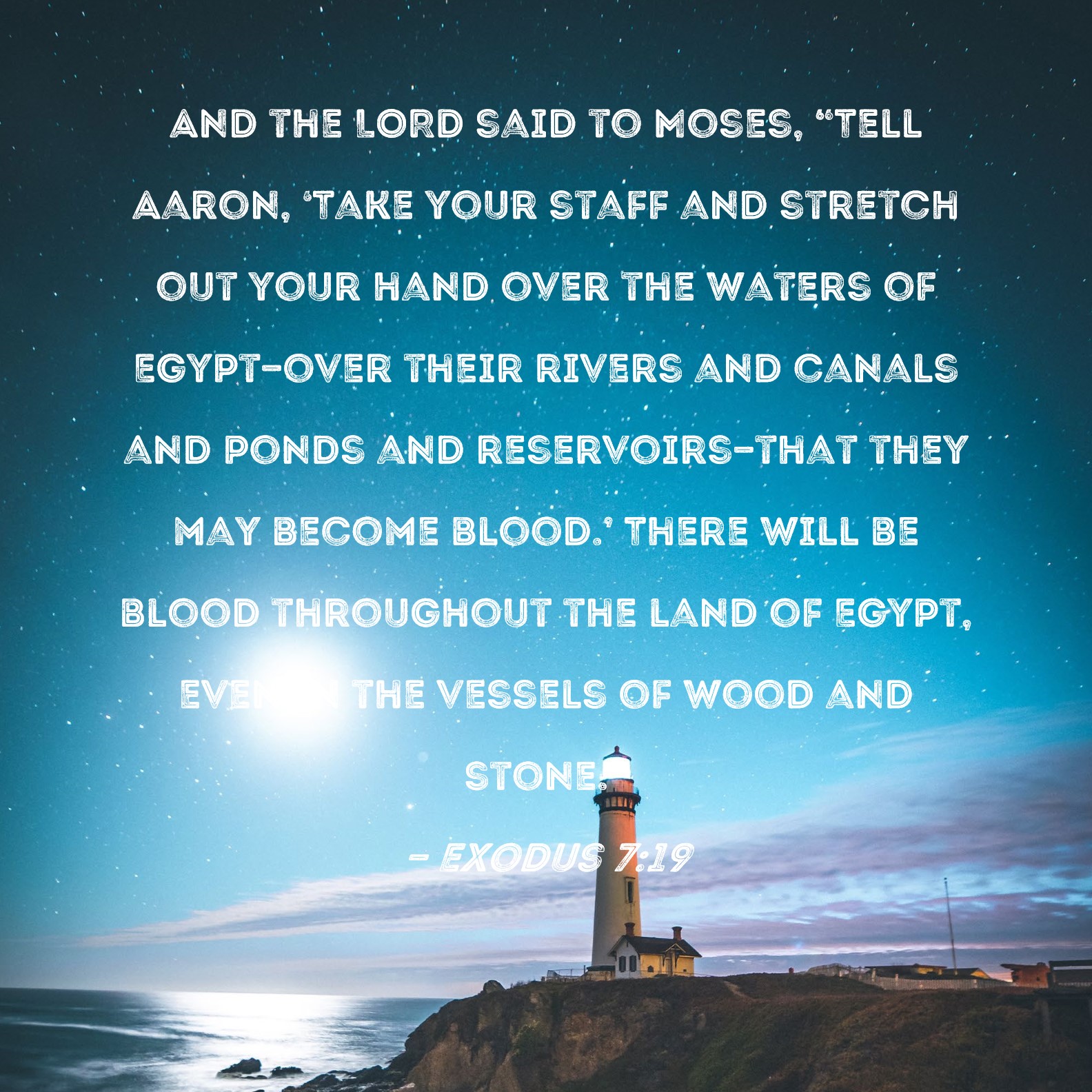 Exodus 7:19 And the LORD said to Moses, "Tell Aaron, 'Take your staff and stretch out your hand over the waters of Egypt--over their rivers and canals and ponds and reservoirs--that they may become blood.' There will be blood throughout the land of Egypt, even in the vessels of wood and stone."