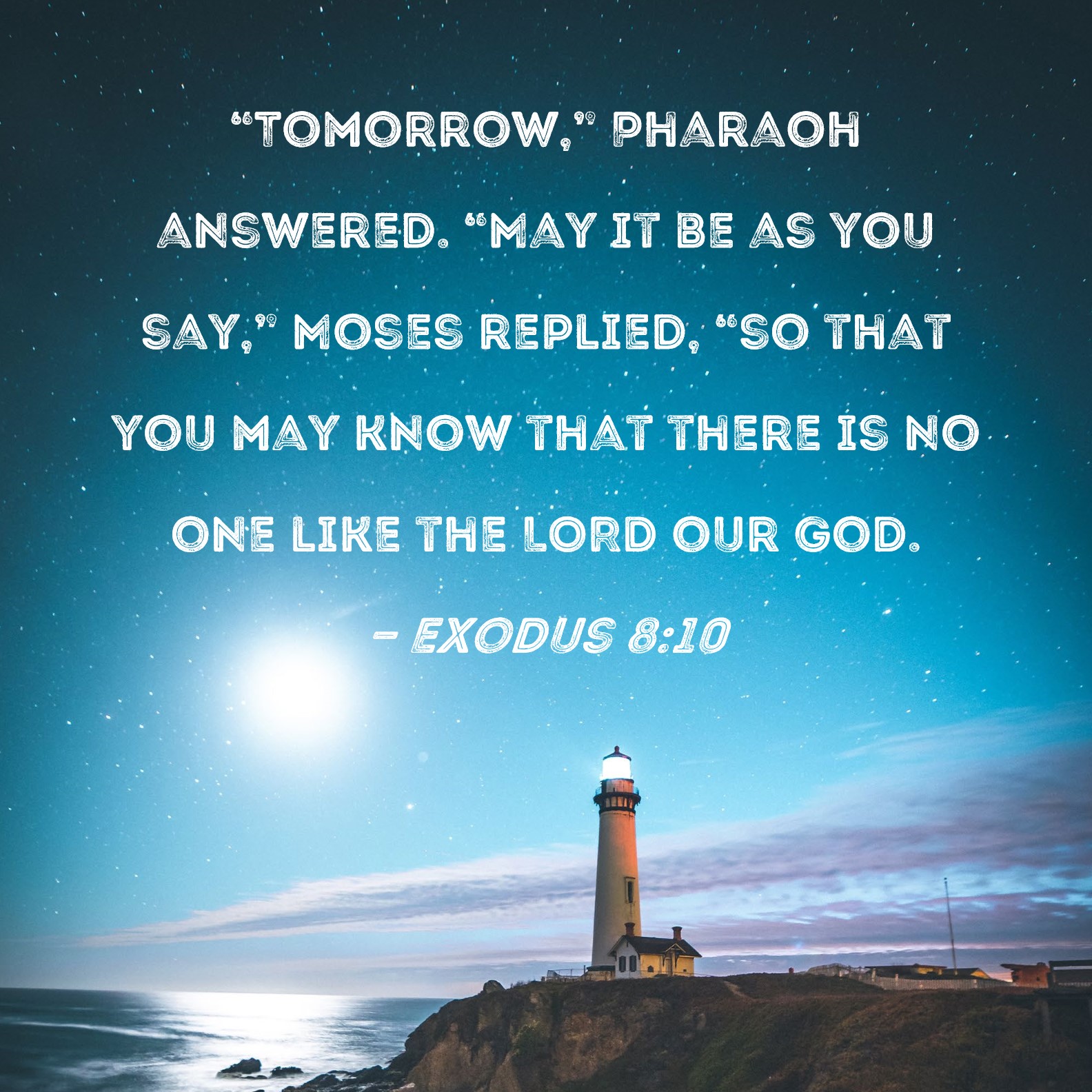 Exodus 8:10 "Tomorrow," Pharaoh answered. "May it be as you say," Moses replied, "so that you may know that there is no one like the LORD our God.