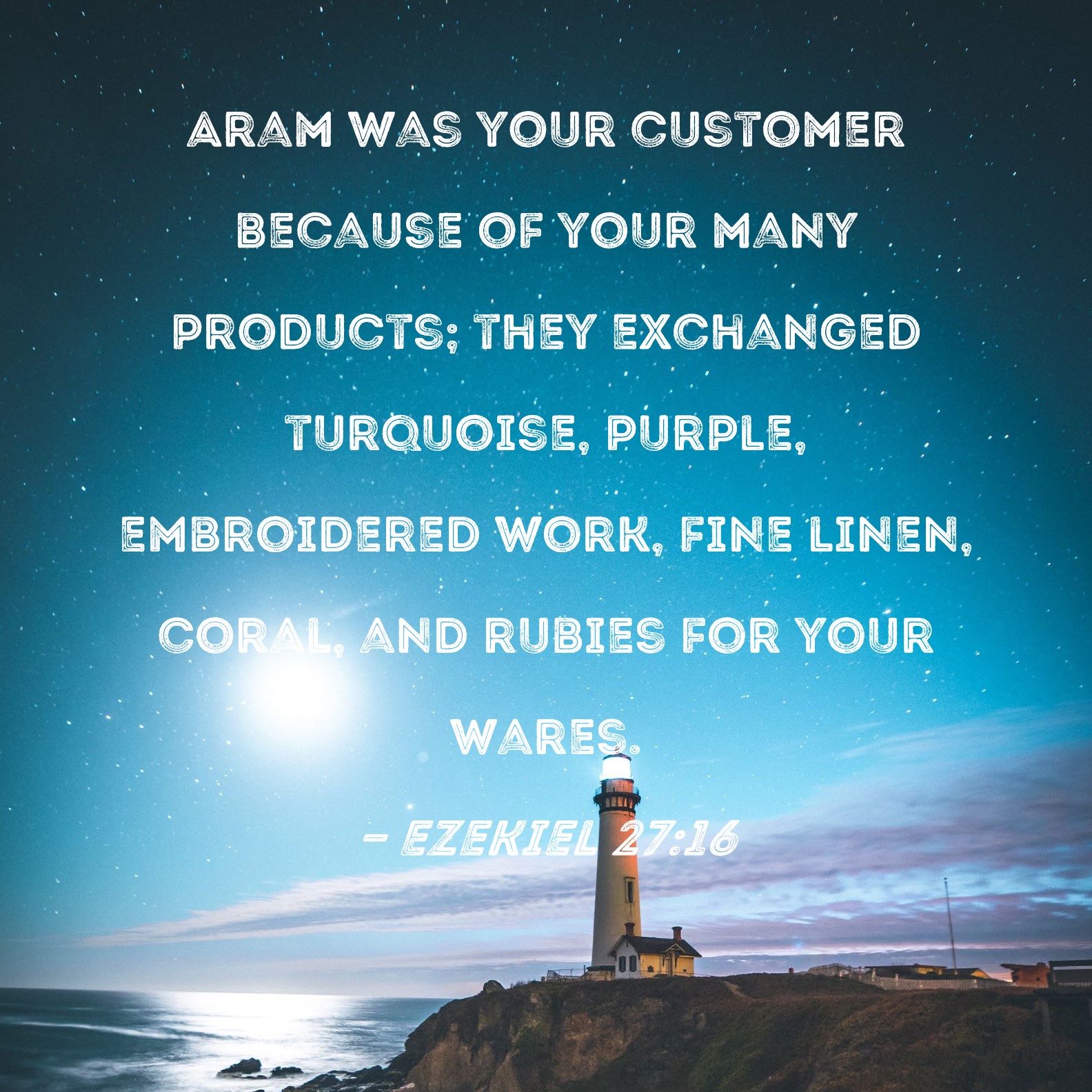 Ezekiel 27:16 Aram was your customer because of your many products; they exchanged turquoise, purple, embroidered work, fine linen, coral, and rubies for your wares.