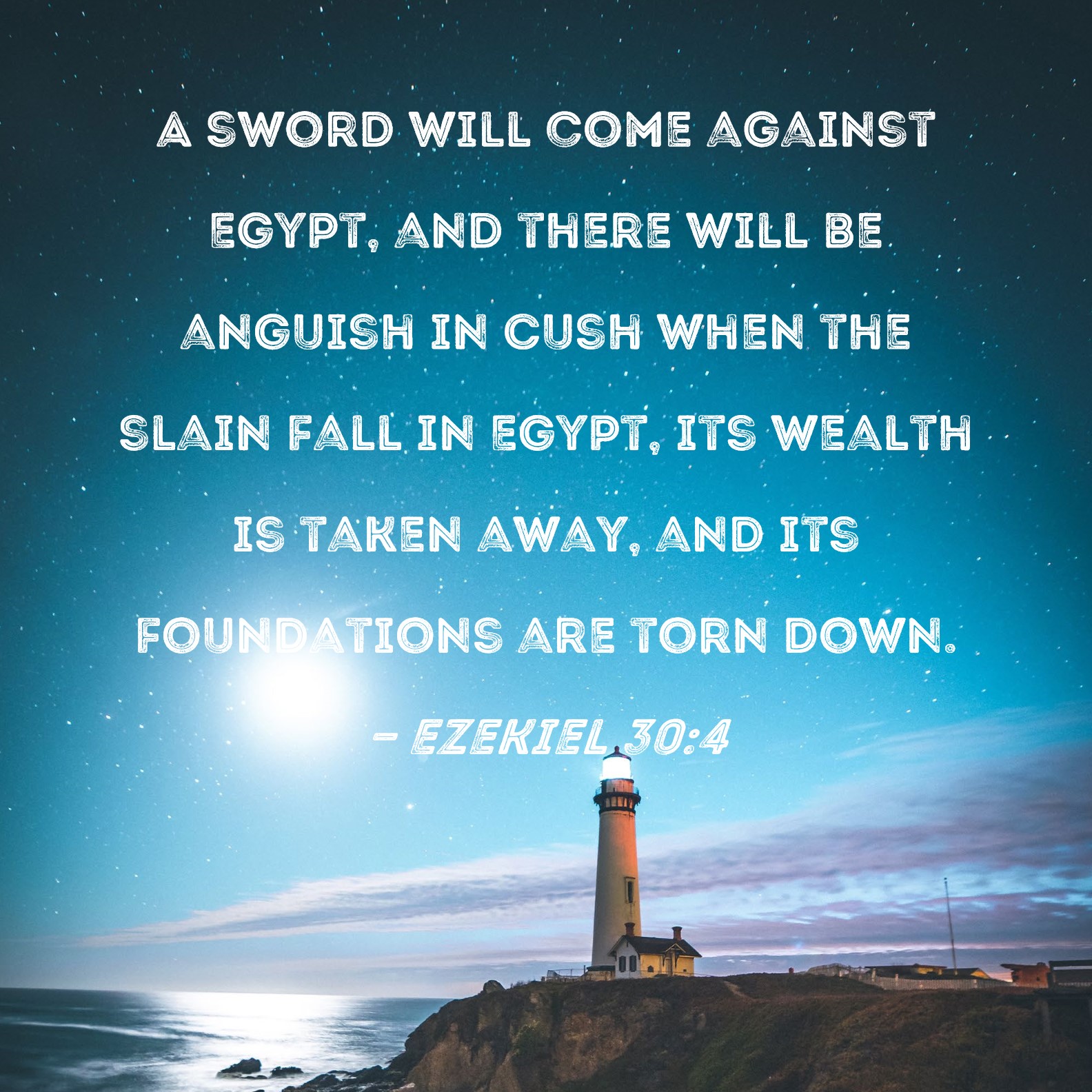 Ezekiel 30:4 A sword will come against Egypt, and there will be anguish in Cush when the slain fall in Egypt, its wealth is taken away, and its foundations are torn down.
