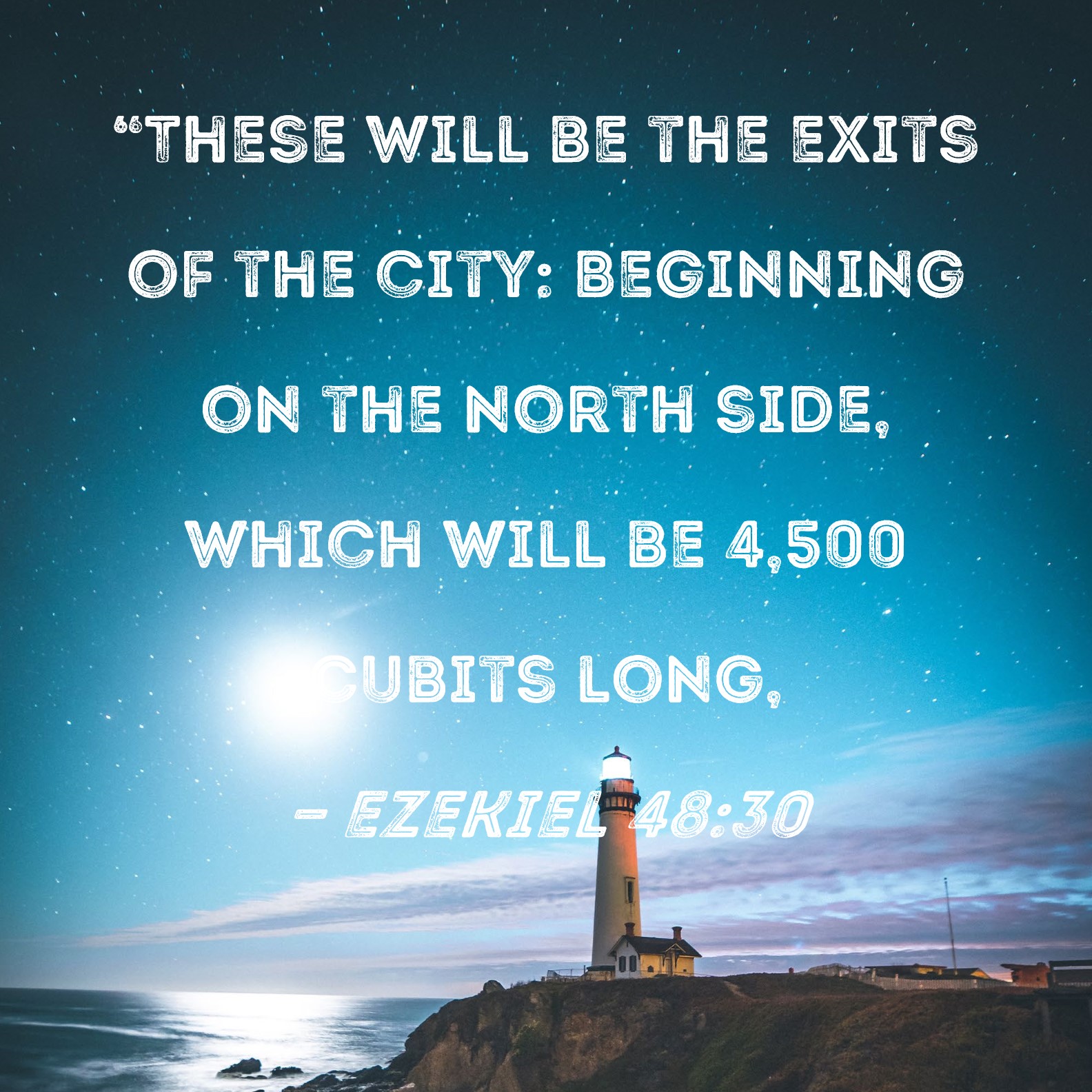 Ezekiel 48:30 "These will be the exits of the city: Beginning on the north side, which will be 4,500 cubits long,