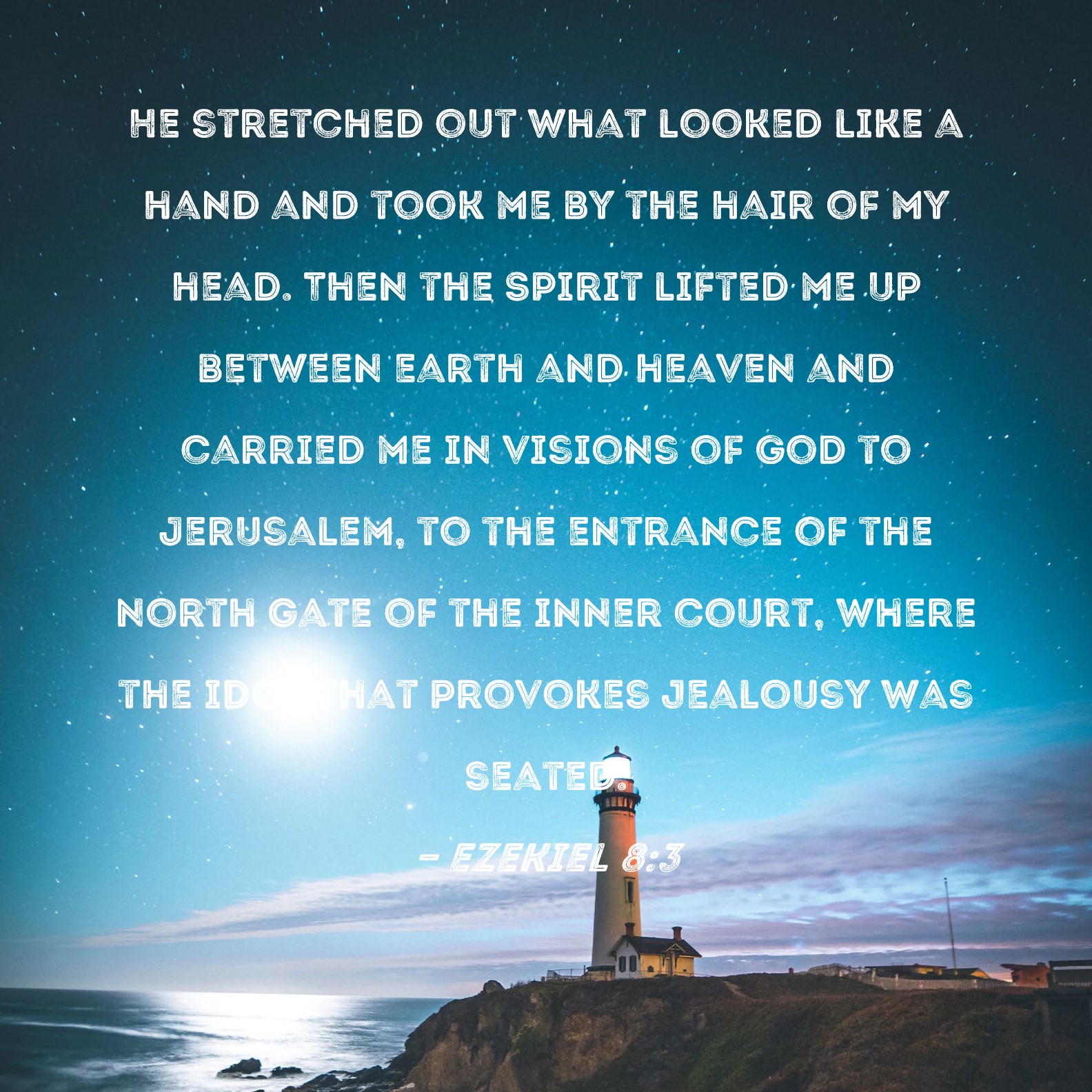 He stretched out what looked like a hand and took me by the hair of my head. Then the Spirit lifted me up between earth and heaven and carried me in visions of God to Jerusalem, to the entrance of the north gate of the inner court, where the idol that provokes jealousy was seated.