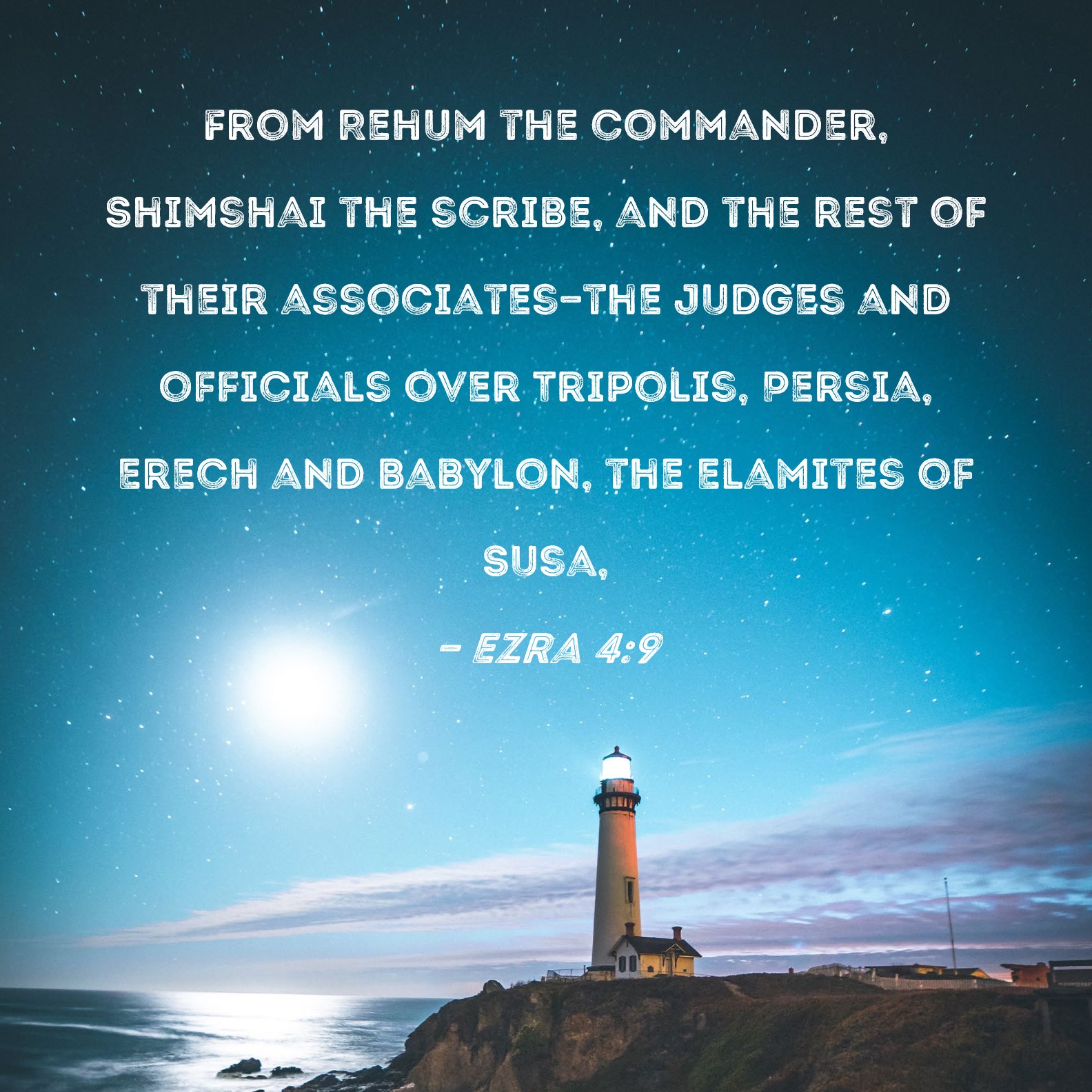 Ezra 4:9 From Rehum the commander, Shimshai the scribe, and the rest of their associates--the judges and officials over Tripolis, Persia, Erech and Babylon, the Elamites of Susa,