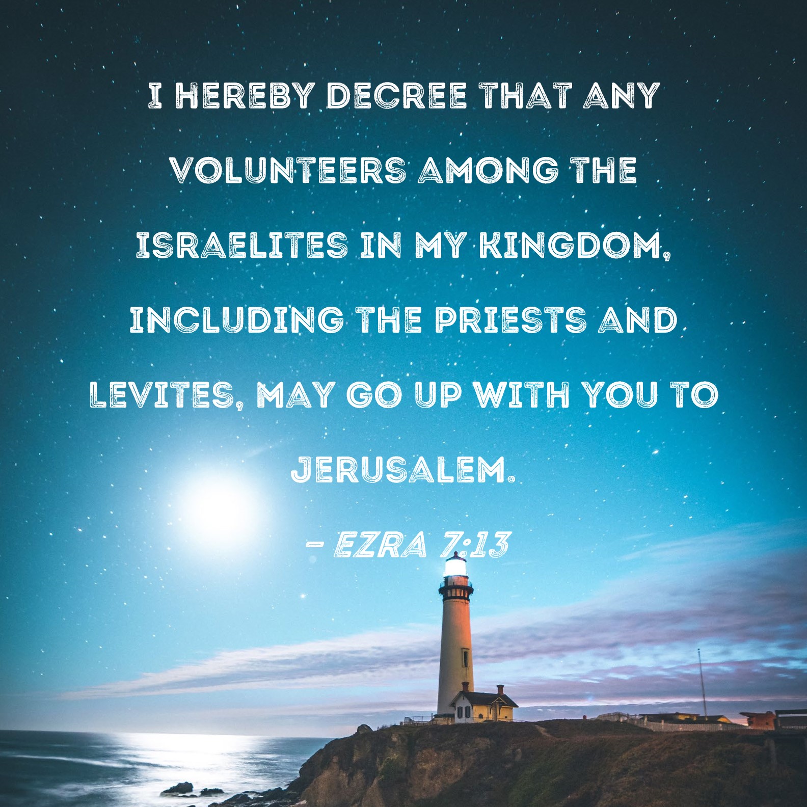 Ezra 7:13 I hereby decree that any volunteers among the Israelites in my kingdom, including the priests and Levites, may go up with you to Jerusalem.