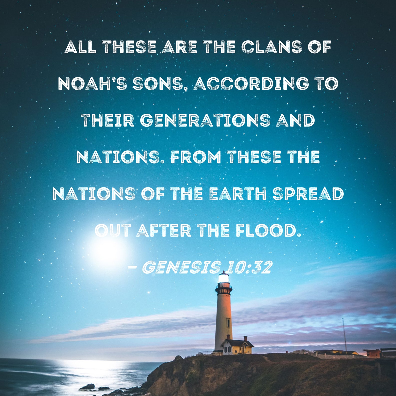 Genesis 10:32 All these are the clans of Noah's sons, according to their generations and nations. From these the nations of the earth spread out after the flood.