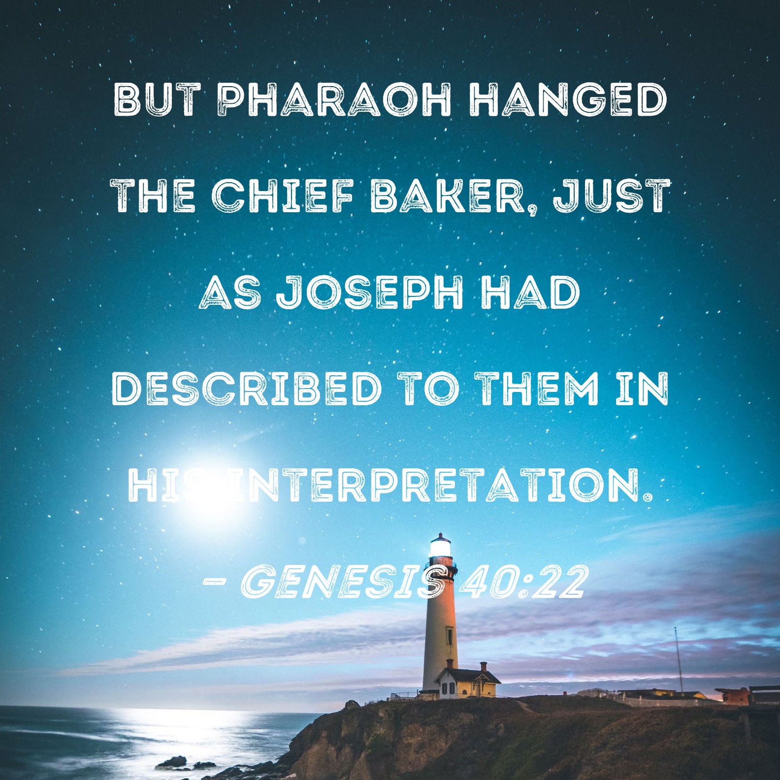 Genesis 40:22 But Pharaoh hanged the chief baker, just as Joseph had described to them in his interpretation.
