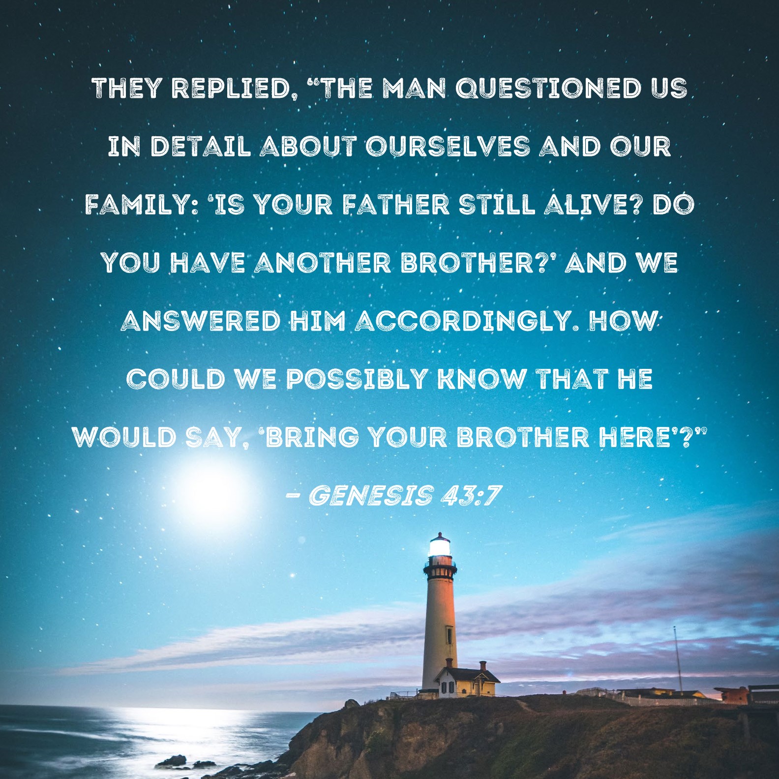 Genesis 43:7 They replied, "The man questioned us in detail about ourselves and our family: 'Is your father still alive? Do you have another brother?' And we answered him accordingly. How could we possibly know that he would say, 'Bring your brother here'?"