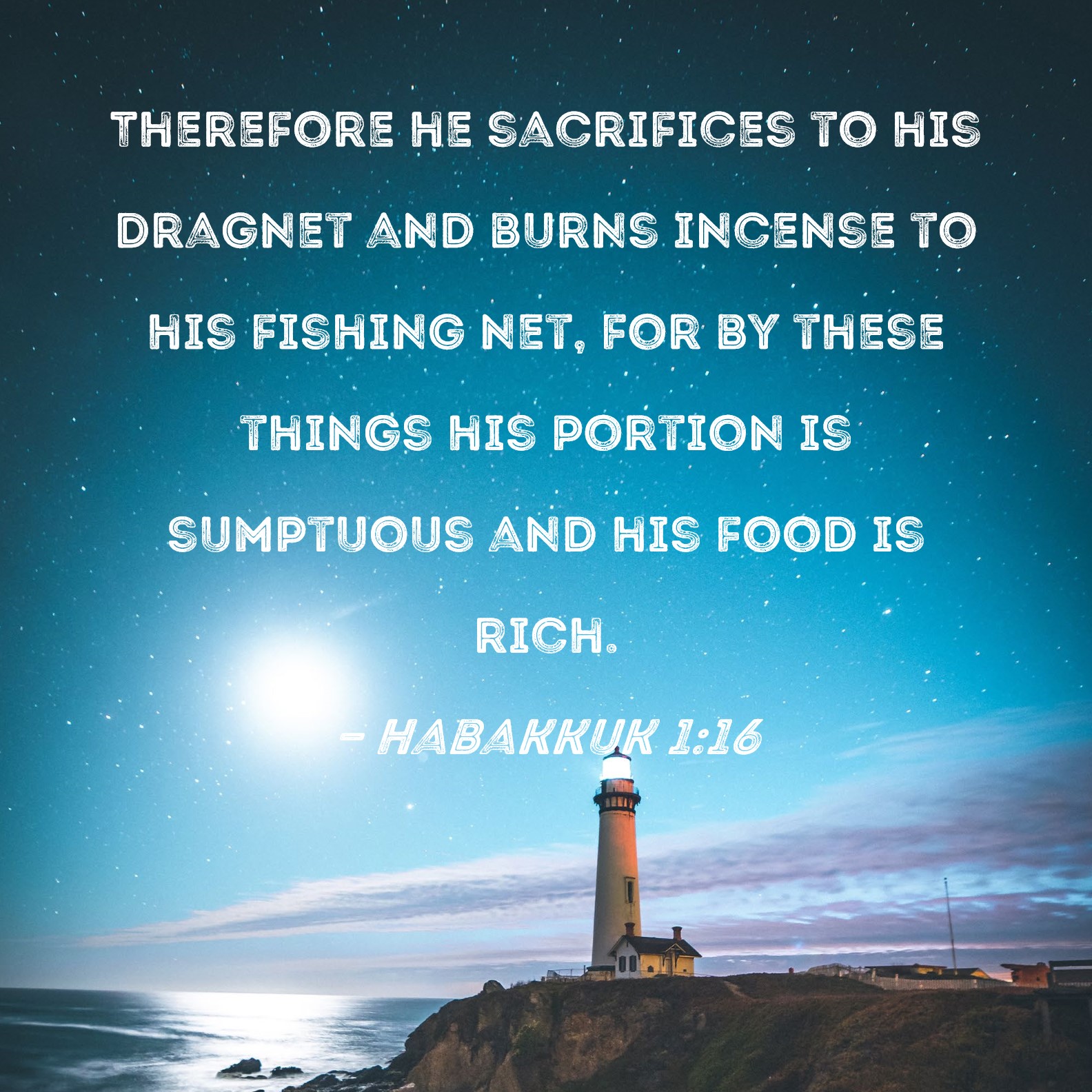 Habakkuk 1:16 Therefore he sacrifices to his dragnet and burns incense to his fishing net, for by these things his portion is sumptuous and his food is rich.