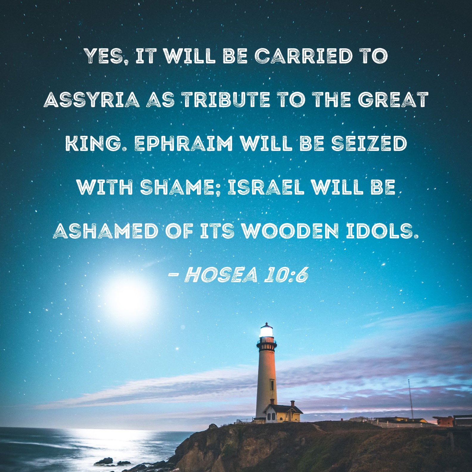 Hosea 10:6 Yes, it will be carried to Assyria as tribute to the great king. Ephraim will be seized with shame; Israel will be ashamed of its wooden idols.