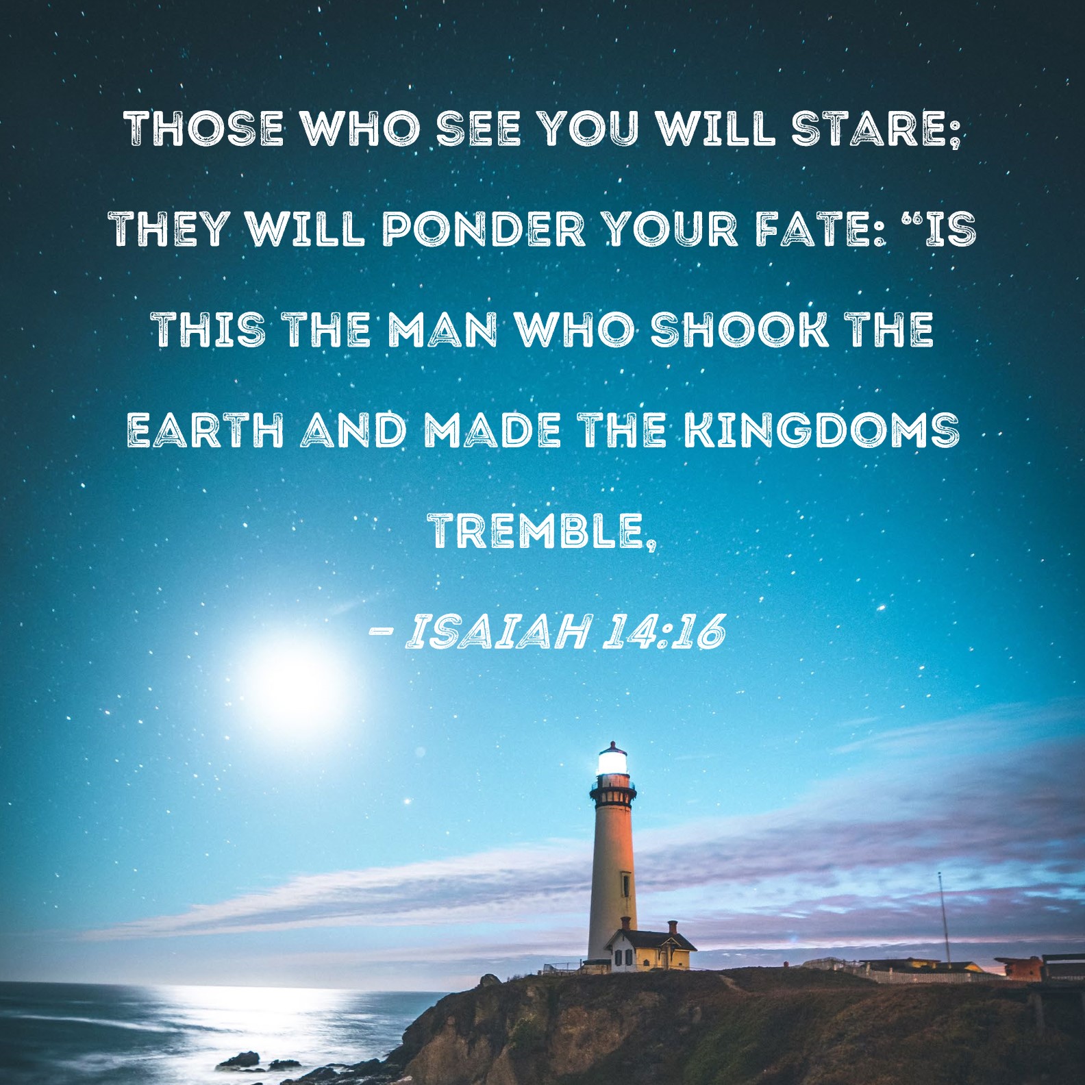 Isaiah 14:16 Those who see you will stare; they will ponder your fate: "Is this the man who shook the earth and made the kingdoms tremble,