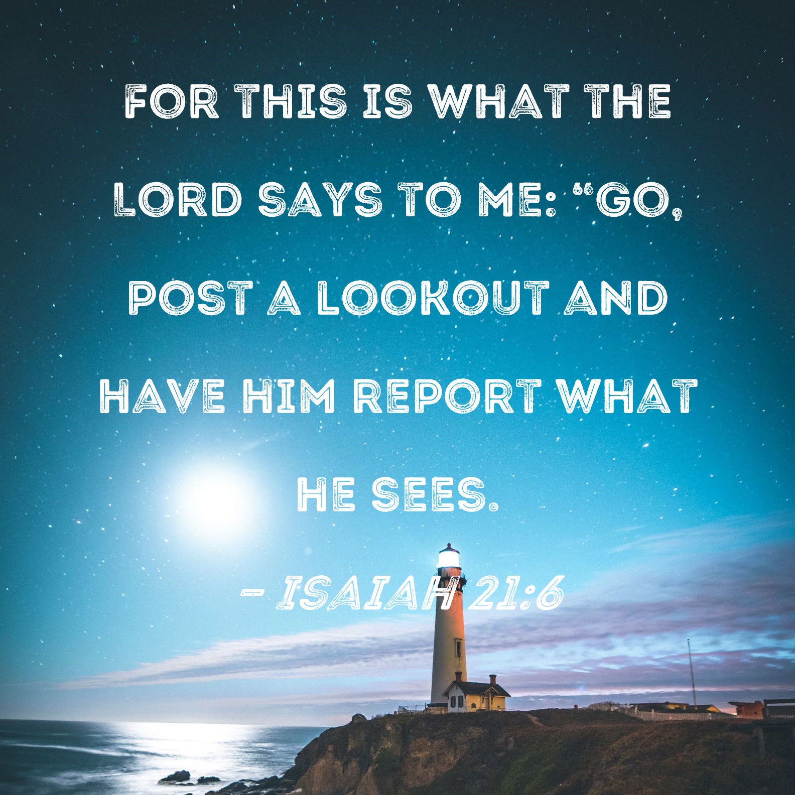 Isaiah 21:6 For this is what the Lord says to me: "Go, post a lookout and have him report what he sees.