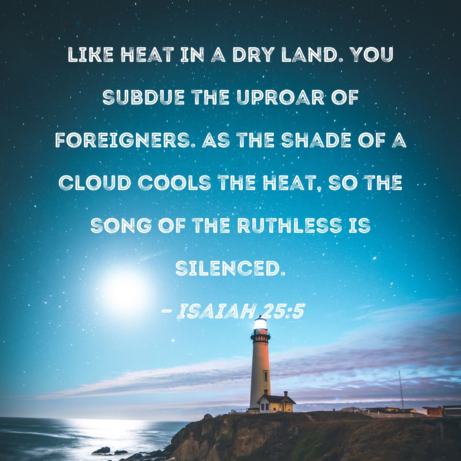 Isaiah 25:5 like heat in a dry land. You subdue the uproar of foreigners. As the shade of a cloud cools the heat, so the song of the ruthless is silenced.