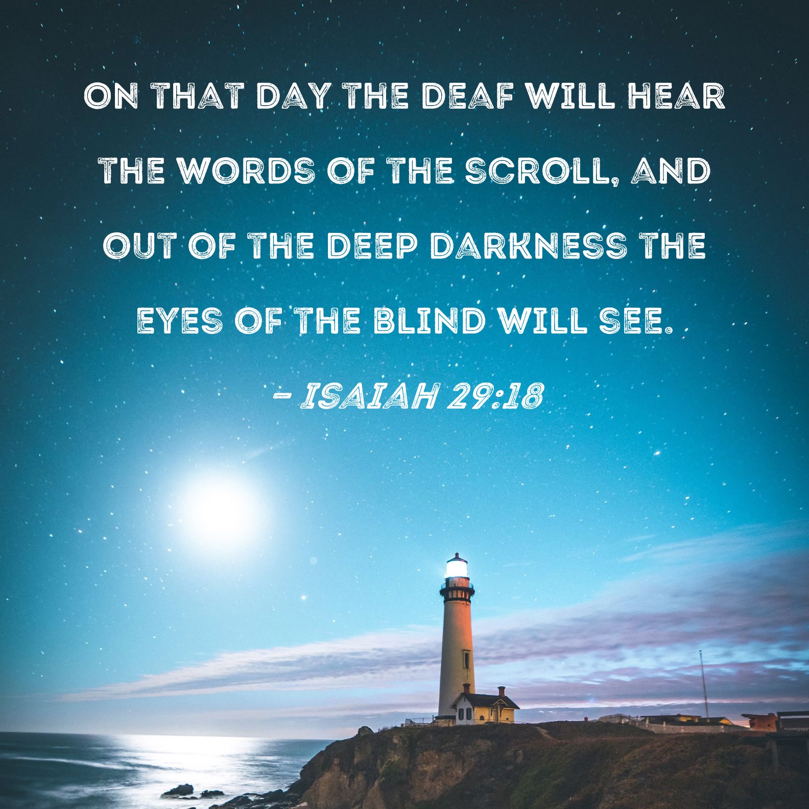 Isaiah 29:18 On that day the deaf will hear the words of the scroll, and out of the deep darkness the eyes of the blind will see.