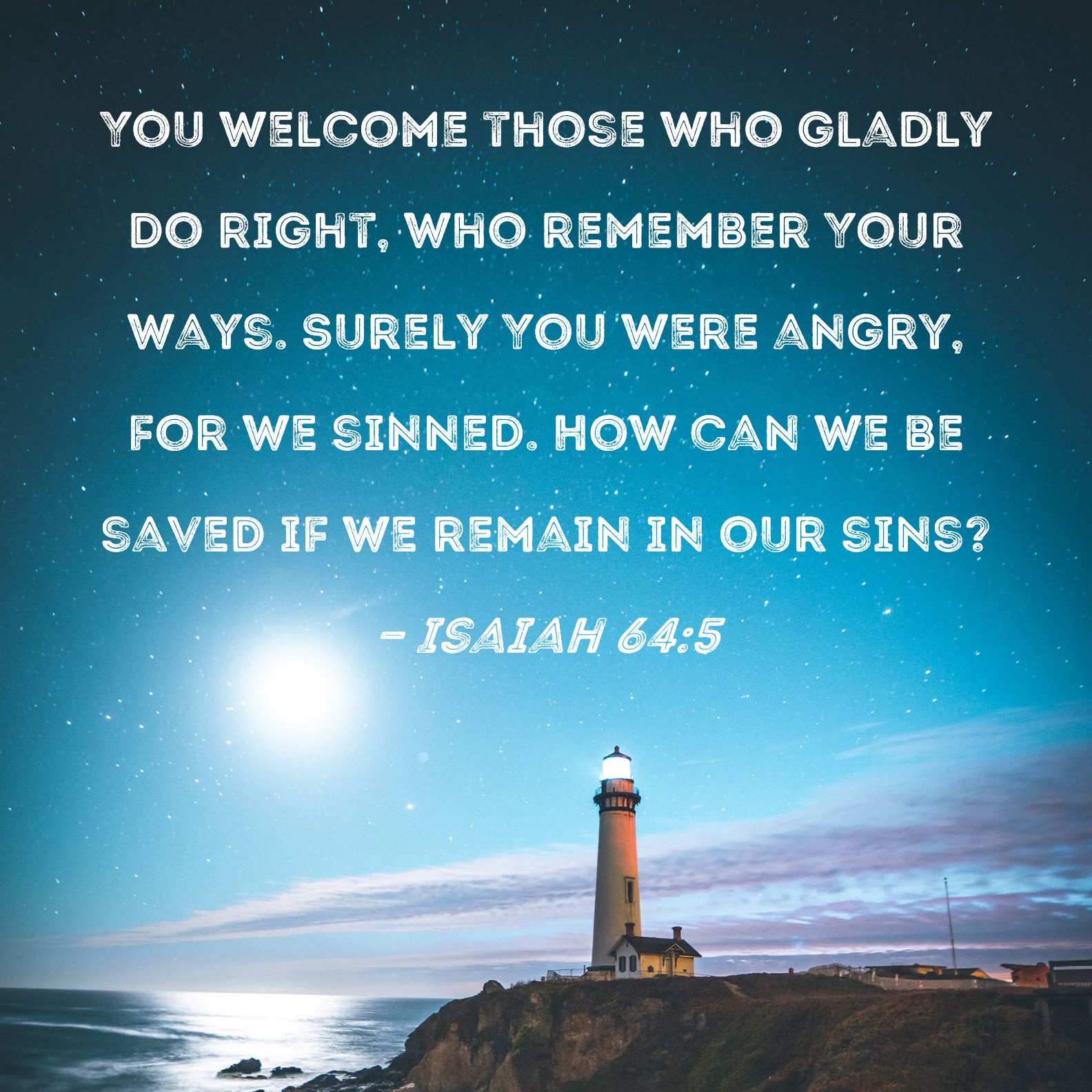 Isaiah 64:5 You welcome those who gladly do right, who remember Your ways. Surely You were angry, for we sinned. How can we be saved if we remain in our sins?