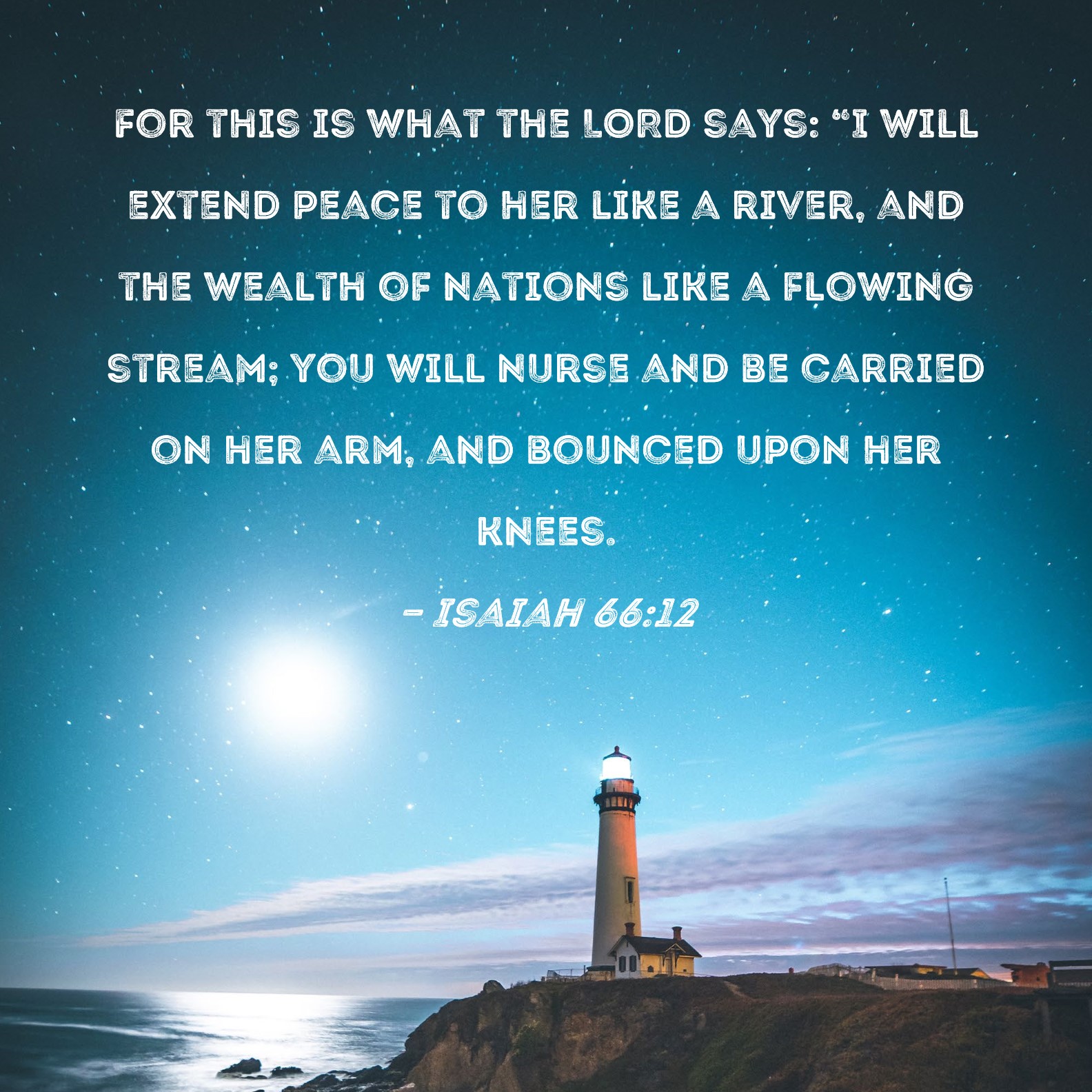 Isaiah 66:12 For this is what the LORD says: "I will extend peace to her like a river, and the wealth of nations like a flowing stream; you will nurse and be carried on her arm, and bounced upon her knees.