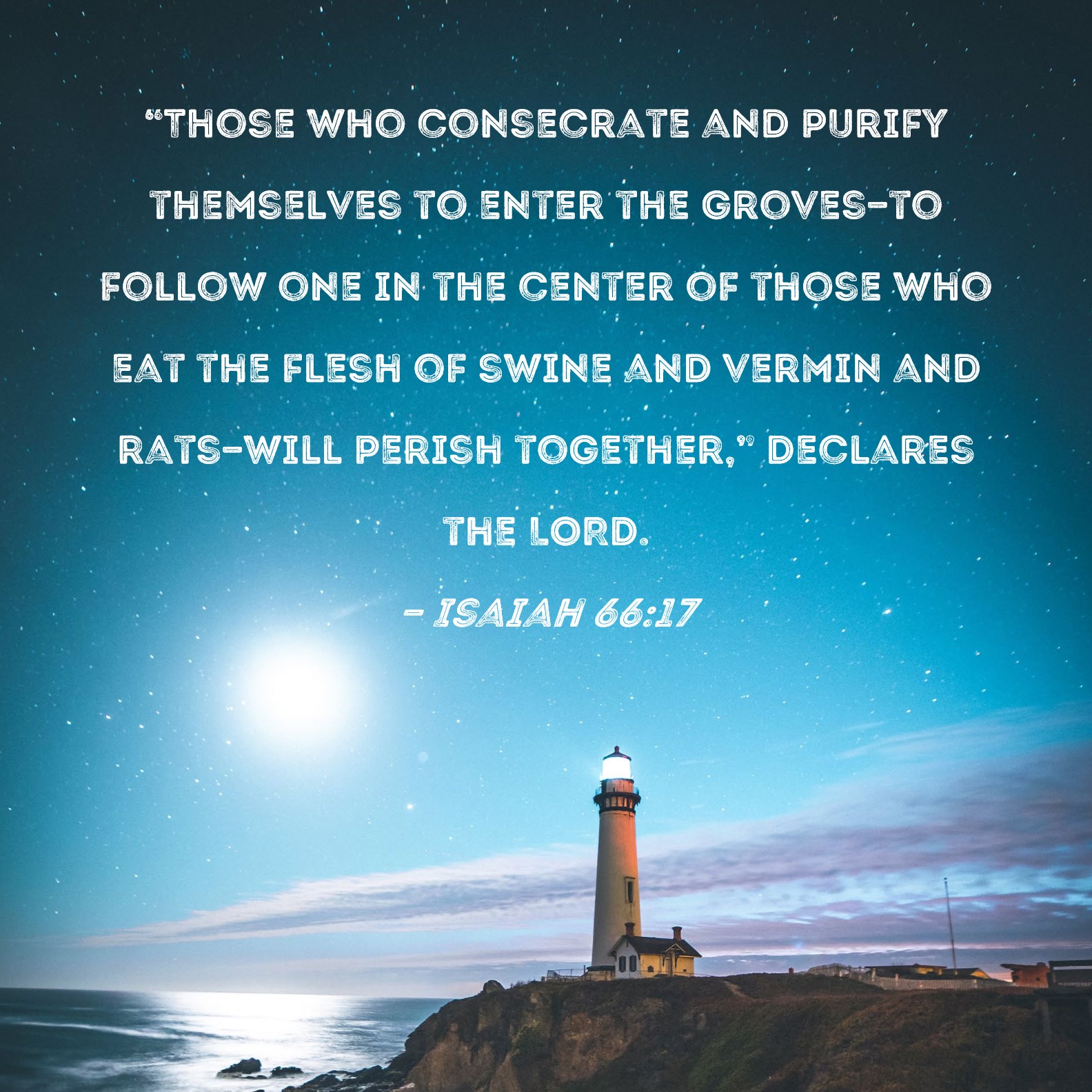 Isaiah 66:17 "Those who consecrate and purify themselves to enter the groves--to follow one in the center of those who eat the flesh of swine and vermin and rats--will perish together," declares the LORD.