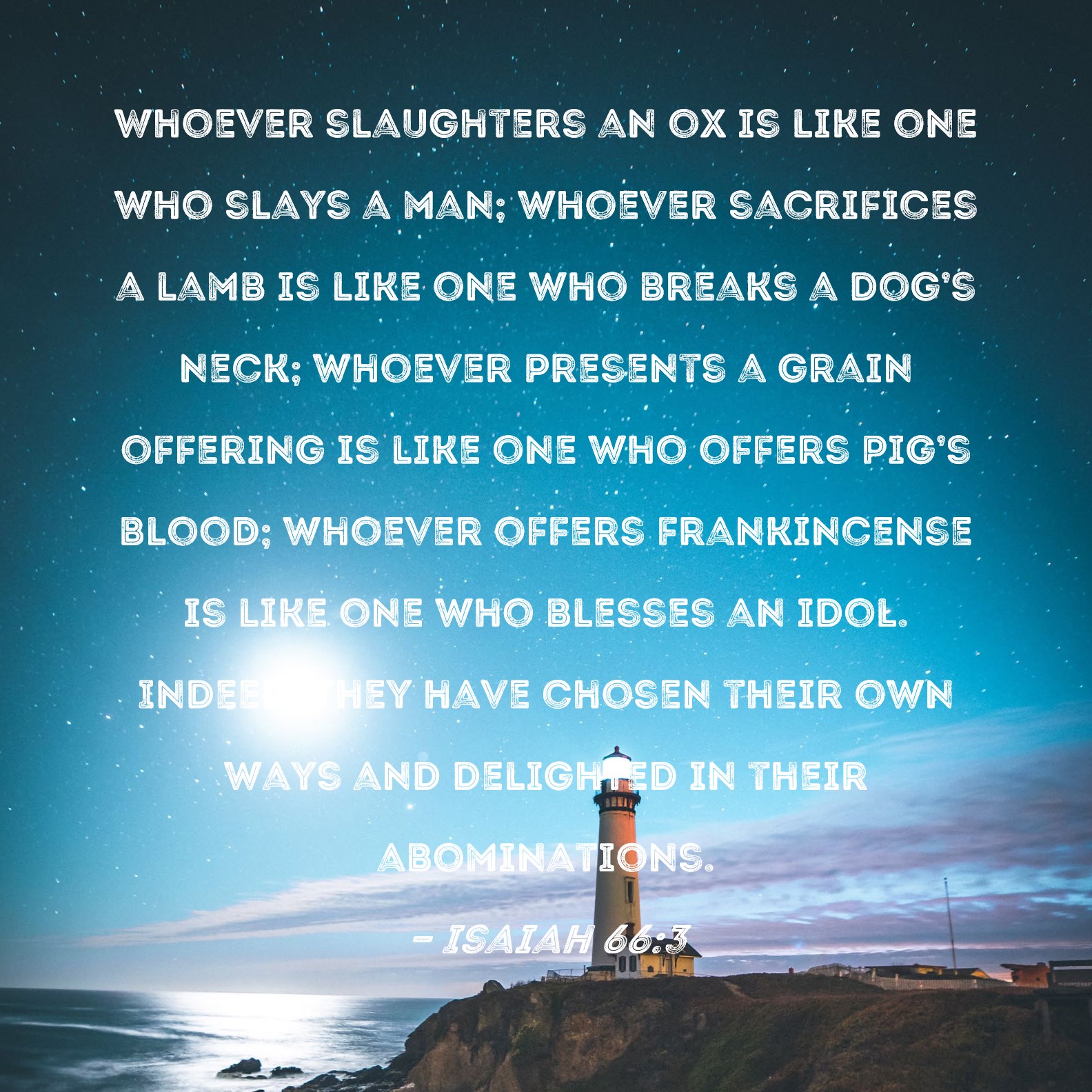 Isaiah 66:3 Whoever slaughters an ox is like one who slays a man; whoever sacrifices a lamb is like one who breaks a dog's neck; whoever presents a grain offering is like one who offers pig's blood; whoever offers frankincense is like one who blesses an idol. Indeed, they have chosen their own ways and delighted in their abominations.