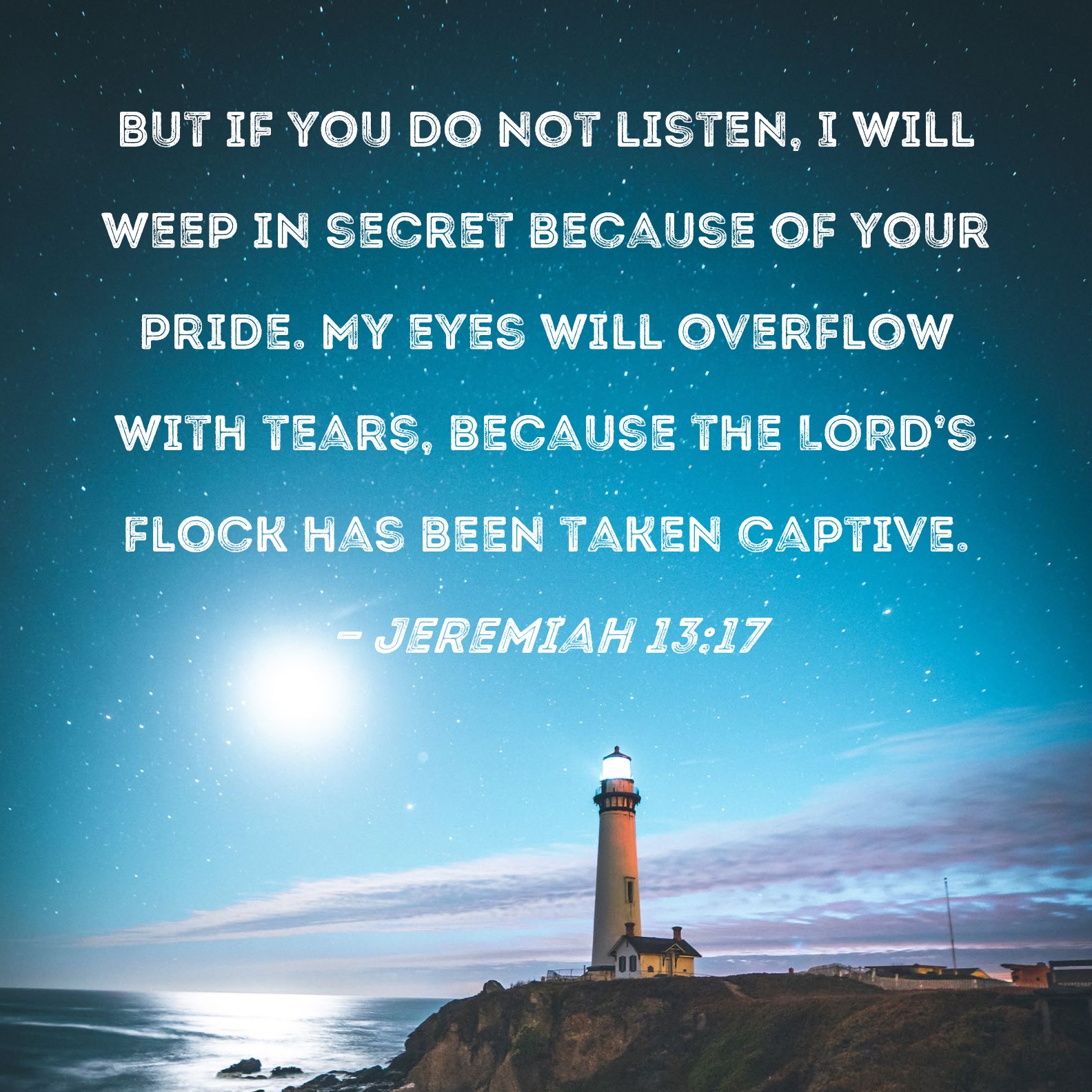 Jeremiah 13:17 But if you do not listen, I will weep in secret because of your pride. My eyes will overflow with tears, because the LORD's flock has been taken captive.