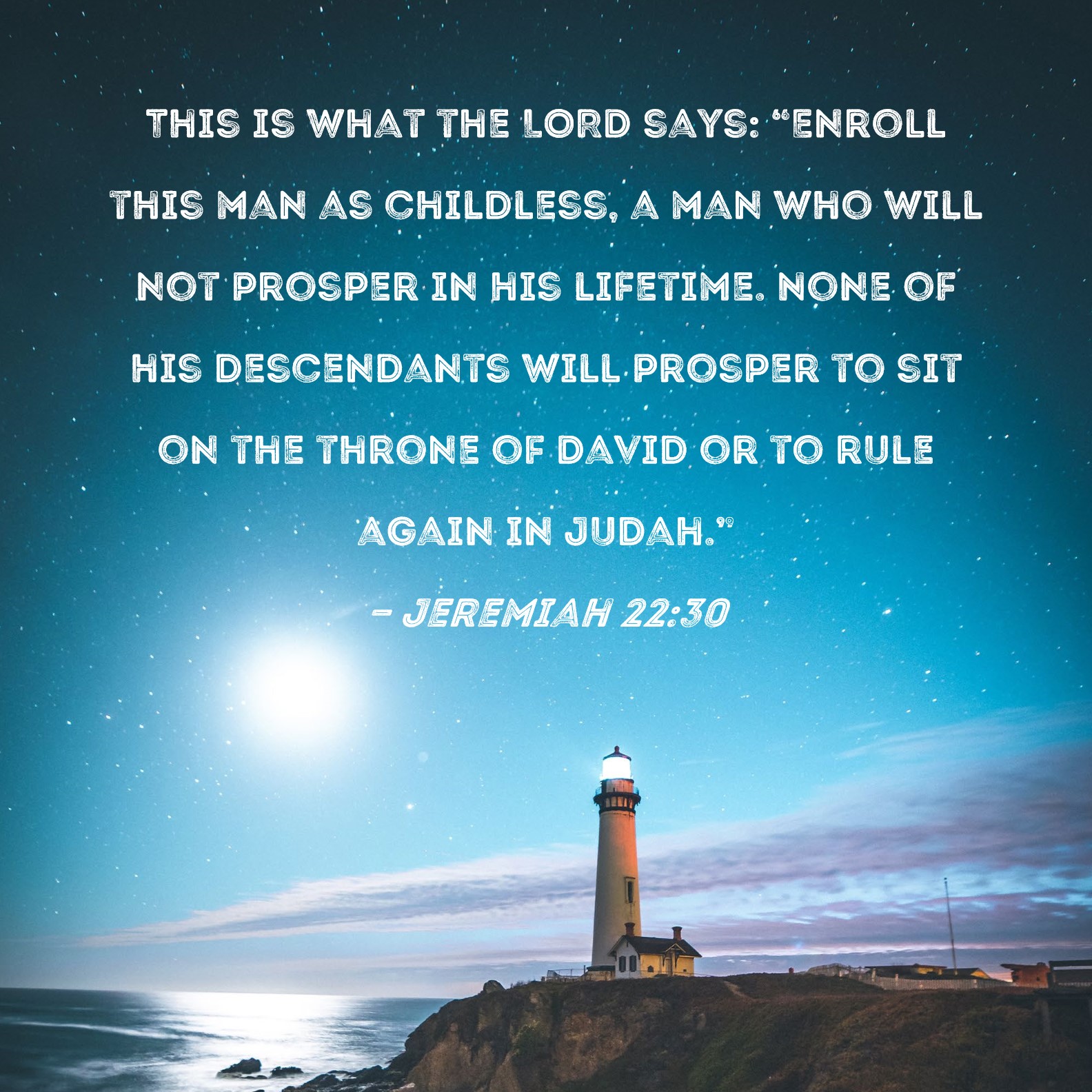 Jeremiah 22:30 This is what the LORD says: "Enroll this man as childless, a man who will not prosper in his lifetime. None of his descendants will prosper to sit on the throne of David or to rule again in Judah."