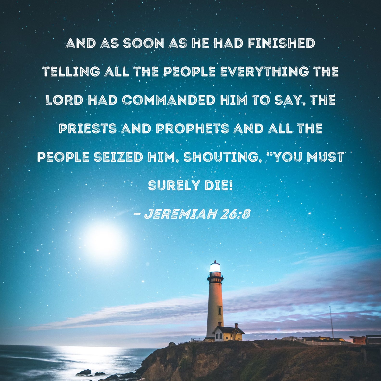 Jeremiah 26:8 and as soon as he had finished telling all the people everything the LORD had commanded him to say, the priests and prophets and all the people seized him, shouting, "You must surely die!