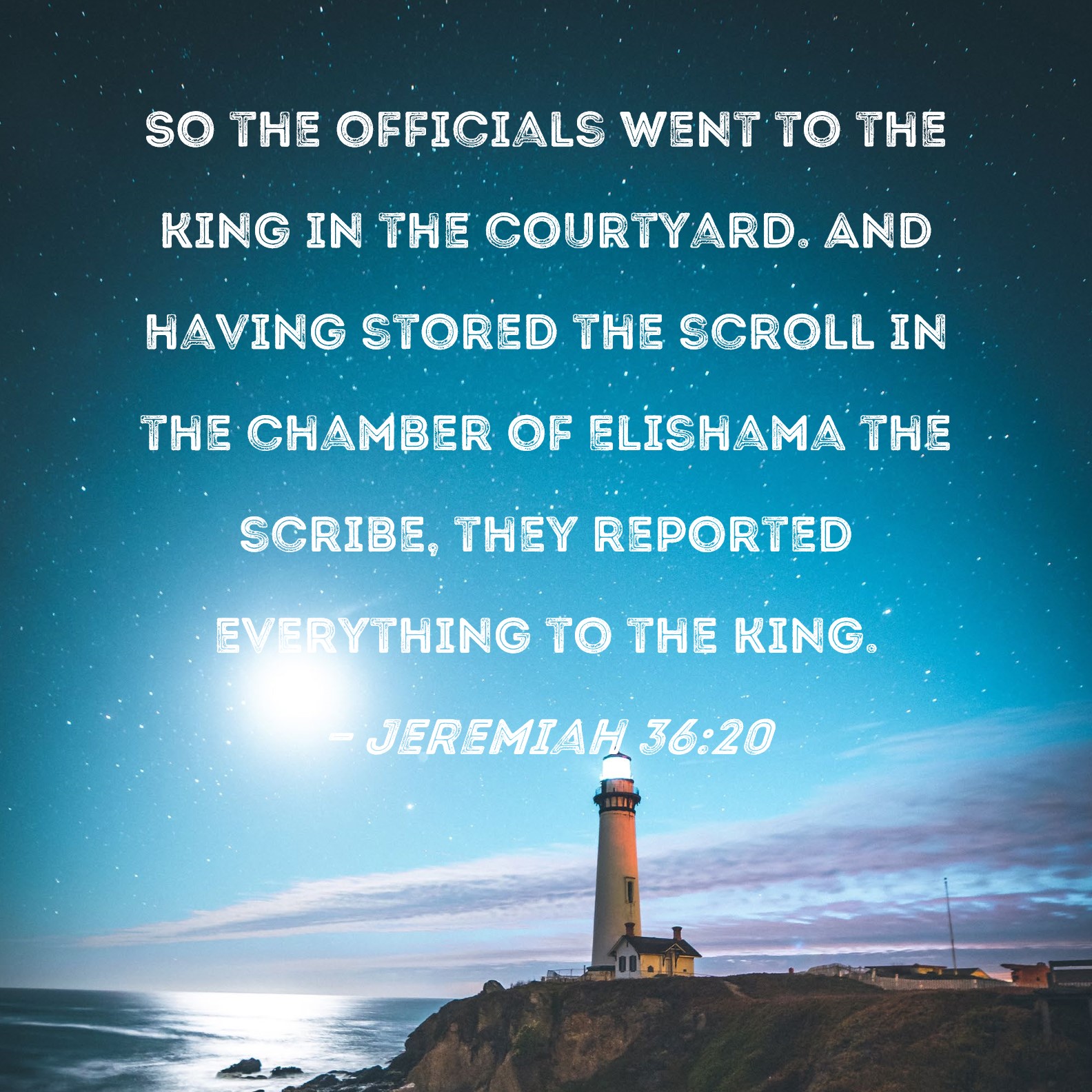 Jeremiah 36:20 So the officials went to the king in the courtyard. And having stored the scroll in the chamber of Elishama the scribe, they reported everything to the king.