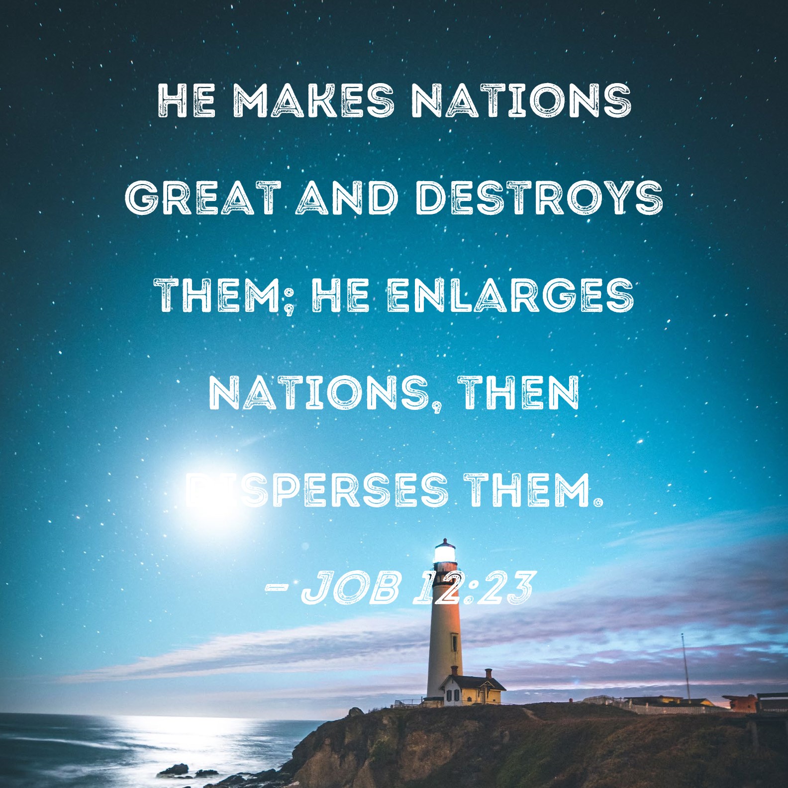 Job 12:23 He makes nations great and destroys them; He enlarges nations, then disperses them.