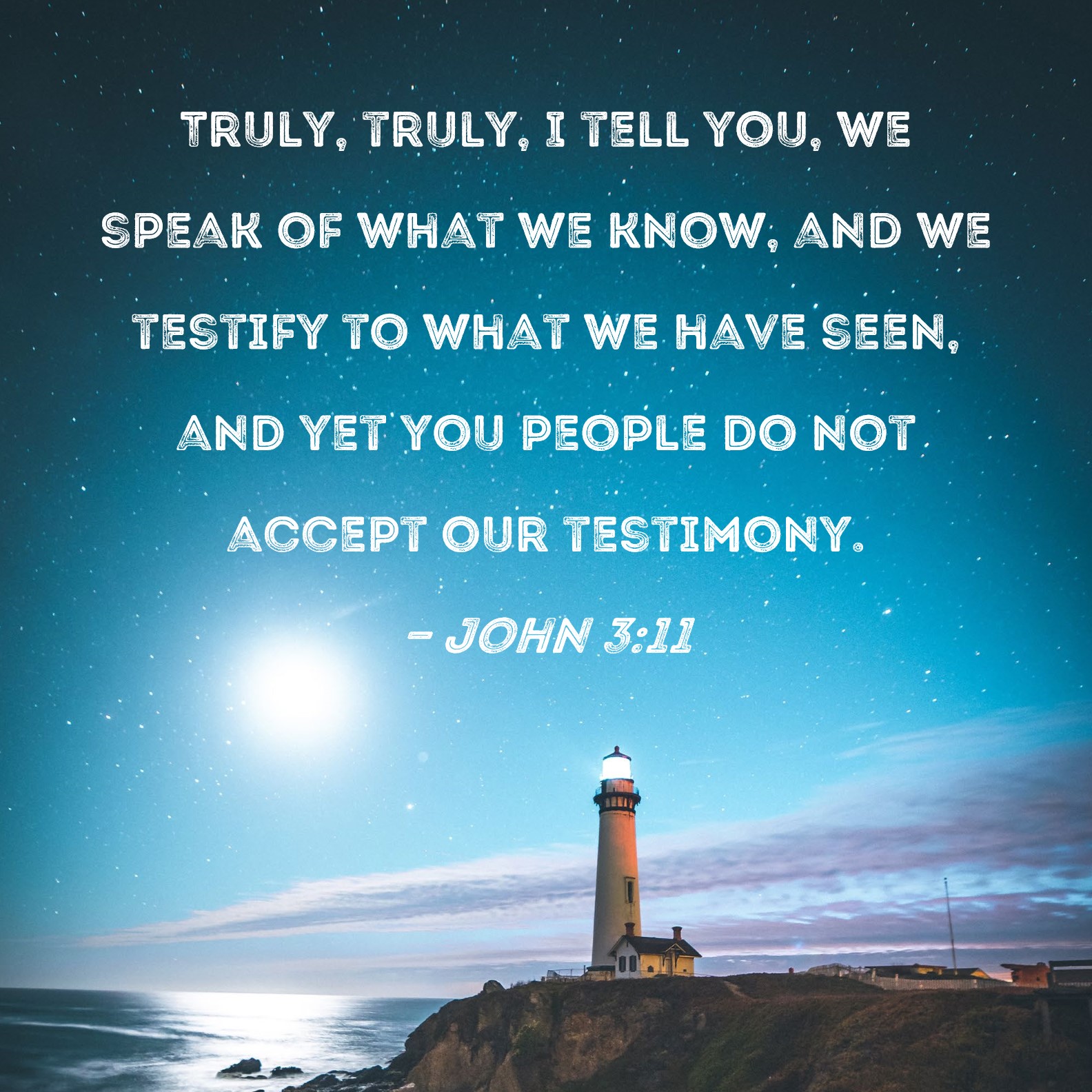 John 3:11 Truly, truly, I tell you, we speak of what we know, and we testify to what we have seen, and yet you people do not accept our testimony.