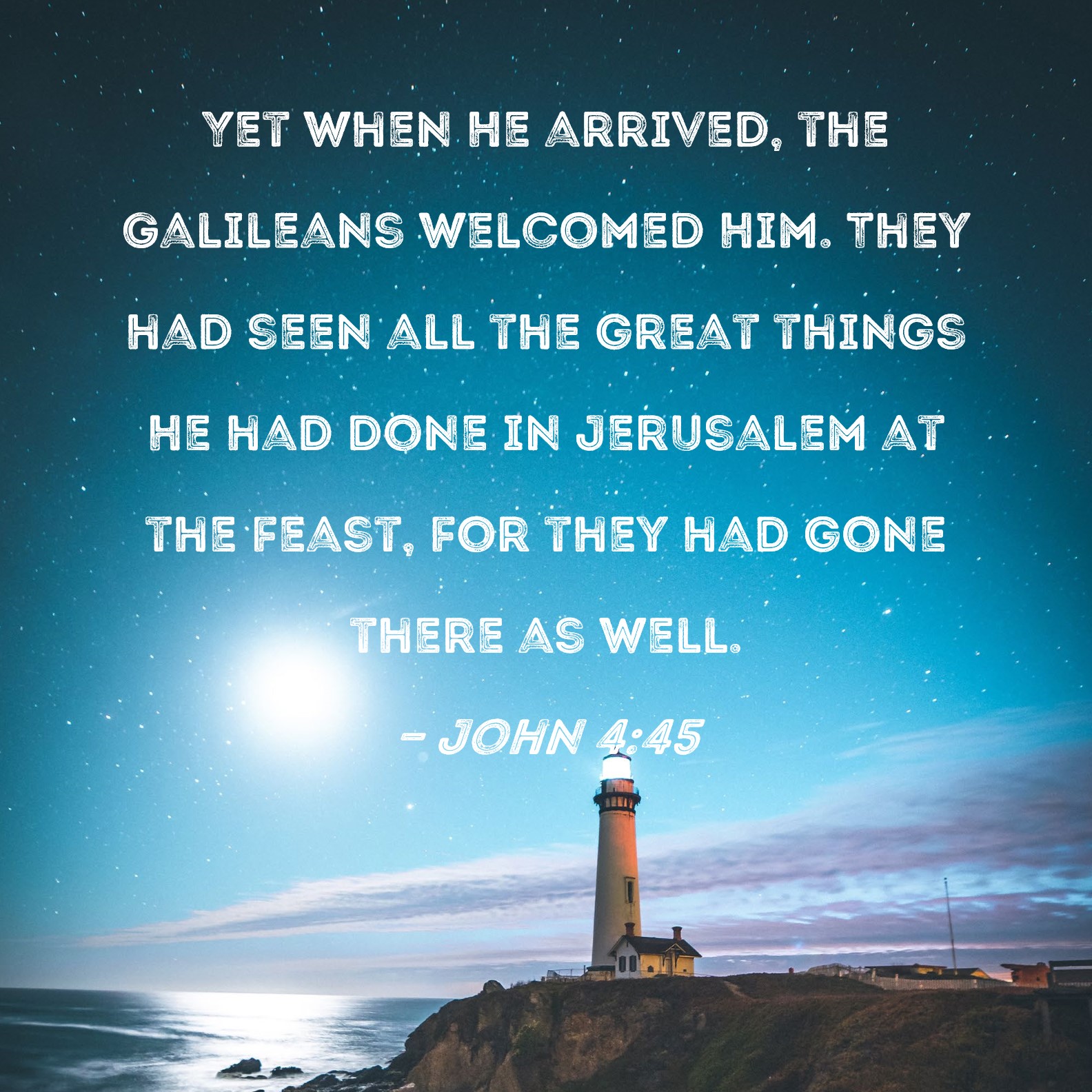 John 4:45 Yet when He arrived, the Galileans welcomed Him. They had seen all the great things He had done in Jerusalem at the feast, for they had gone there as well.