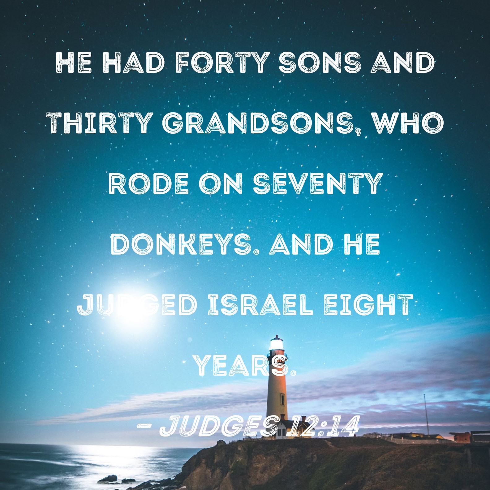 Judges 12:14 He had forty sons and thirty grandsons, who rode on seventy donkeys. And he judged Israel eight years.