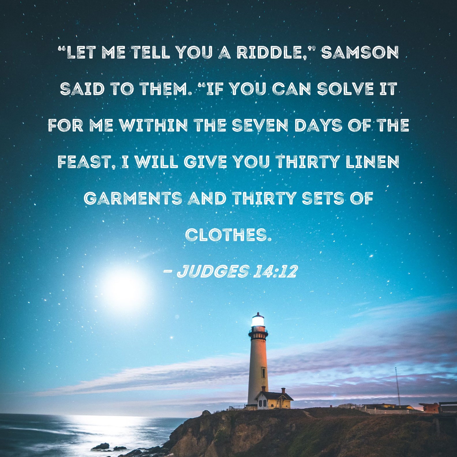 Judges 14:12 "Let me tell you a riddle," Samson said to them. "If you can solve it for me within the seven days of the feast, I will give you thirty linen garments and thirty sets of clothes.