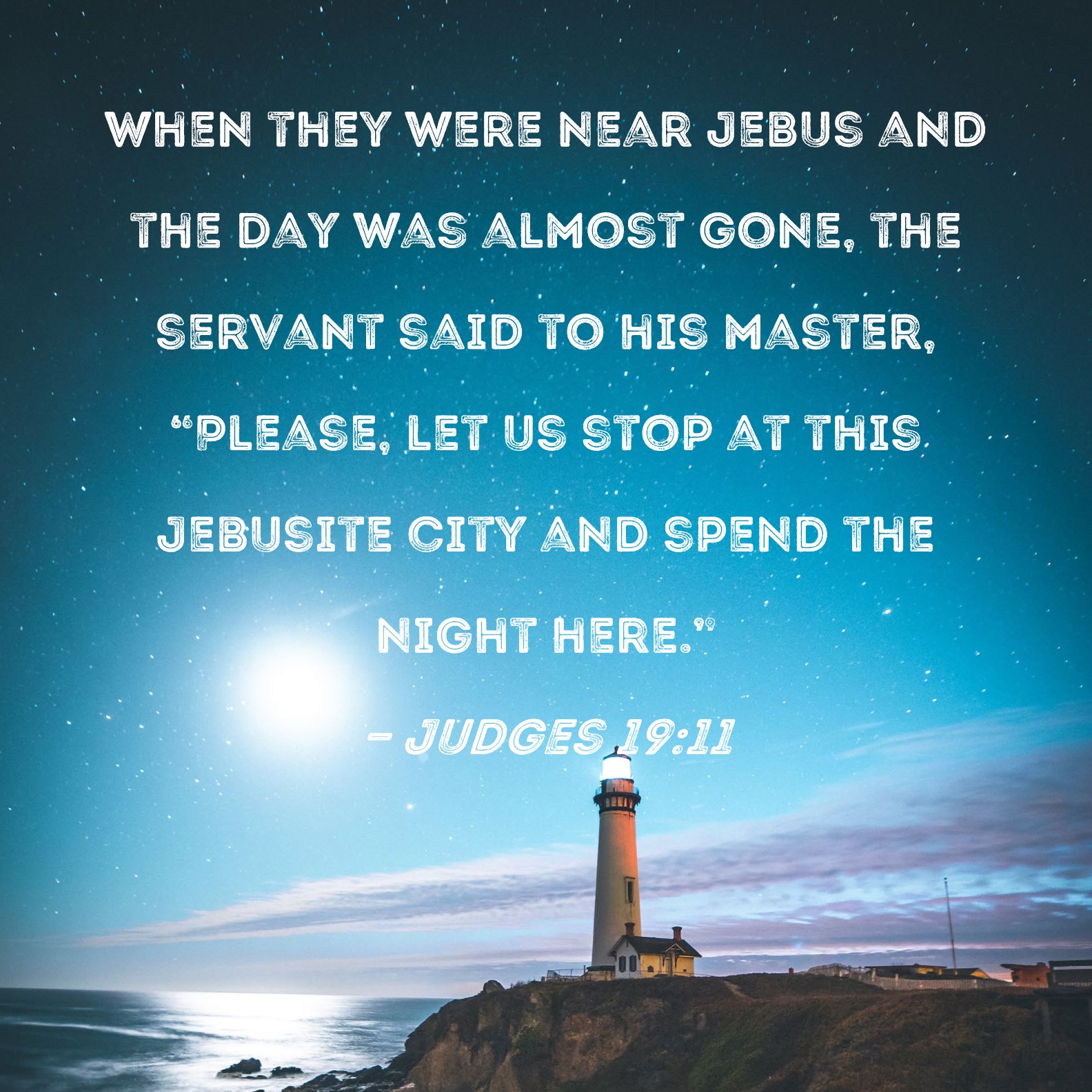 Judges 19:11 When they were near Jebus and the day was almost gone, the servant said to his master, "Please, let us stop at this Jebusite city and spend the night here."